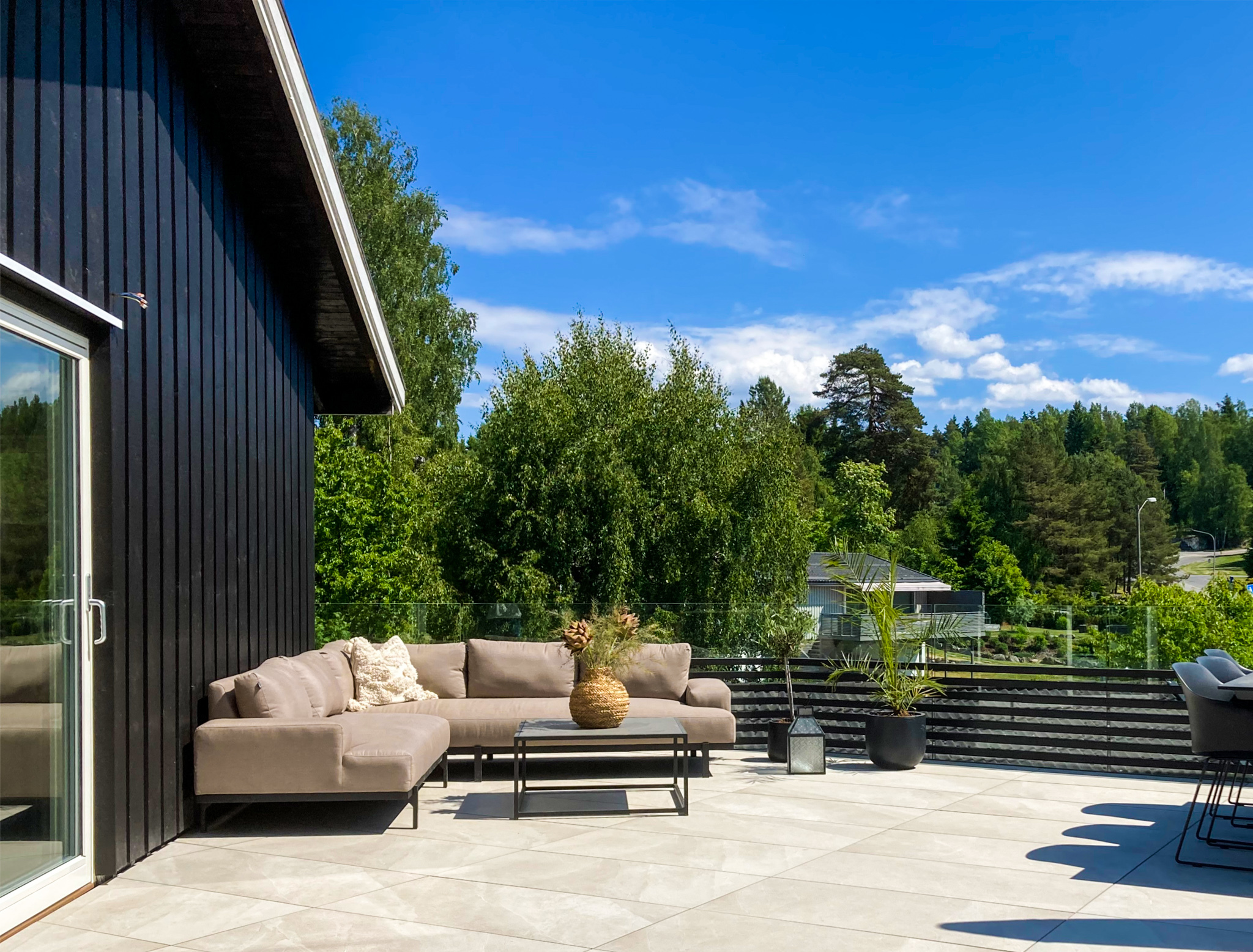 Det var ønskelig med terrasse på taket med direkte utgang fra stuen i 1.etasje. Løsningen ble et tilbygg på ca. 50 m2 mot syd. Boligen er én av de første man møter ved atkomsten til Ingieråsen boligområde. Det er nylig utarbeidet en plan for området med strenge krav til ny bebyggelse for å ivareta områdekarakteren med tidstypiske hus med høy arkitektonisk kvalitet. Alle tilbygg og ombygginger blir kulturminnefaglig vurdert. Det var derfor viktig å innlede en dialog med kommunen i innfasing av prosjektet med vurdering av alternativer. Løsningen ble et tilbygg som klart fremstår som en addisjon av vår tid, men som tar opp linjeføring, elementer og farge fra det opprinnelige huset. Tilbyggets geometri vinkles i forhold til orientering mot hage og uteplass og i forhold til nabobebyggelse og eiendomsgrense.