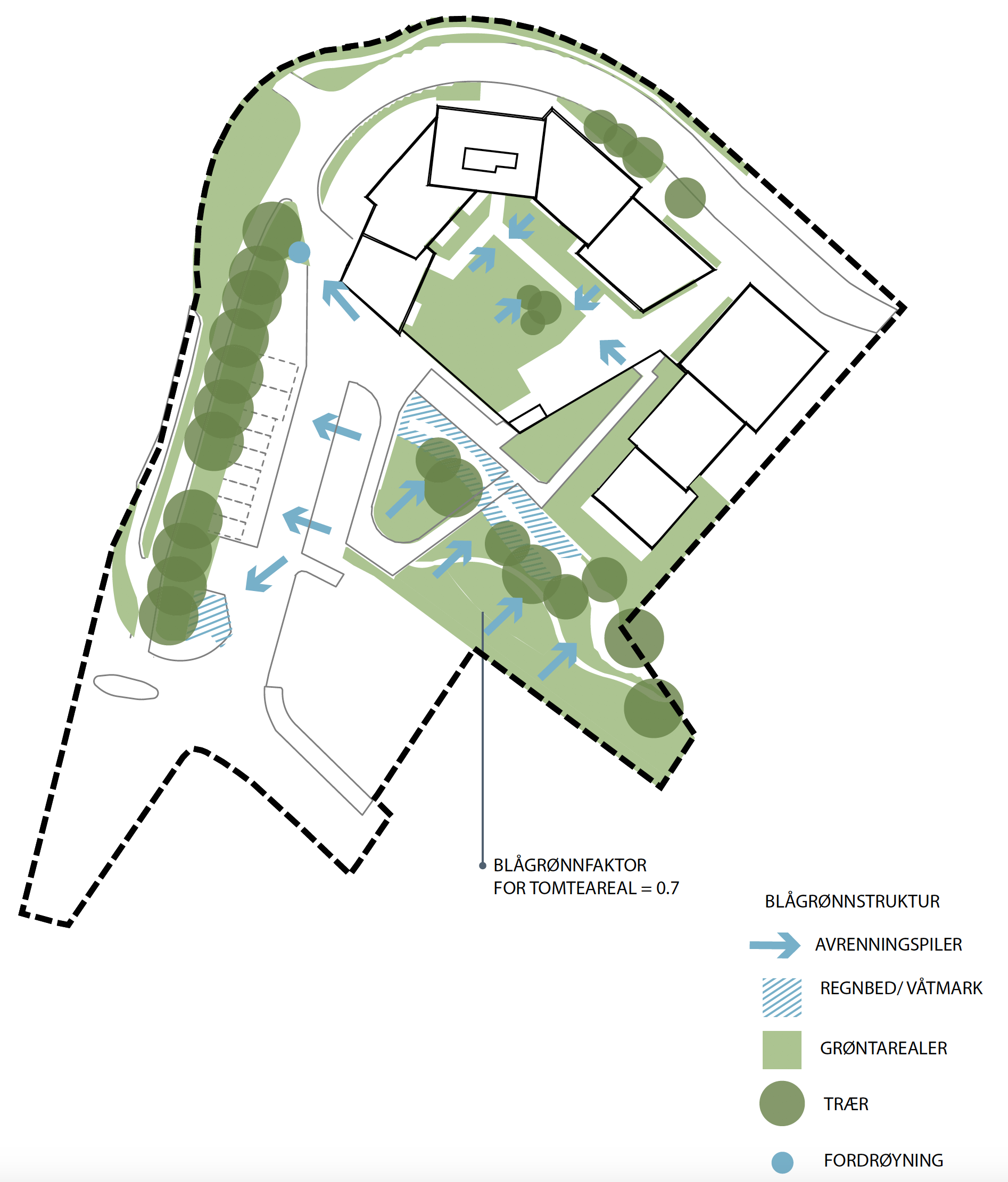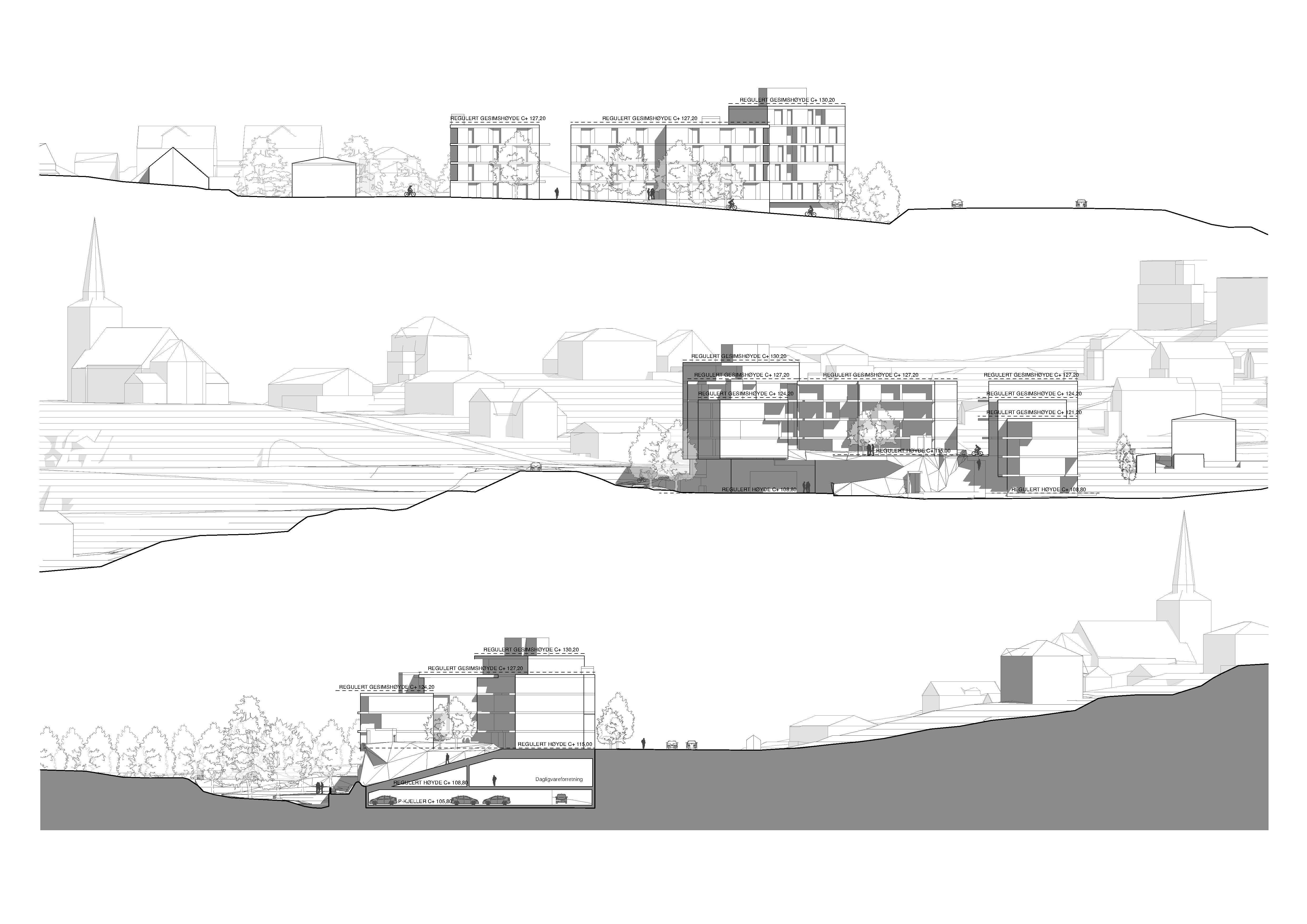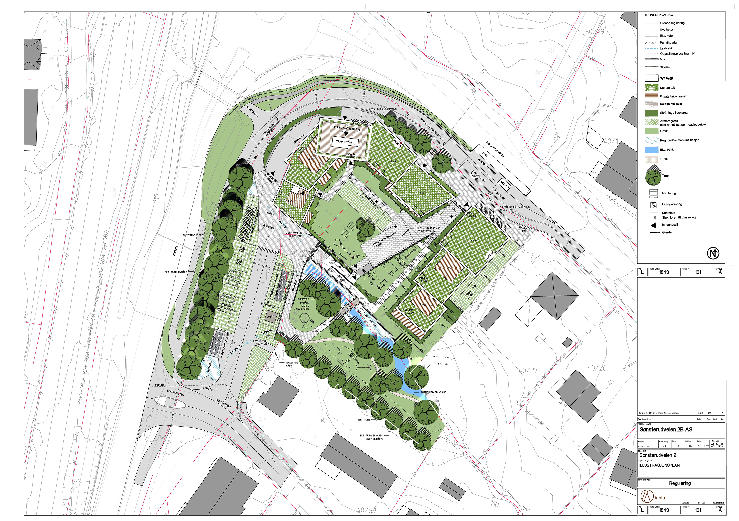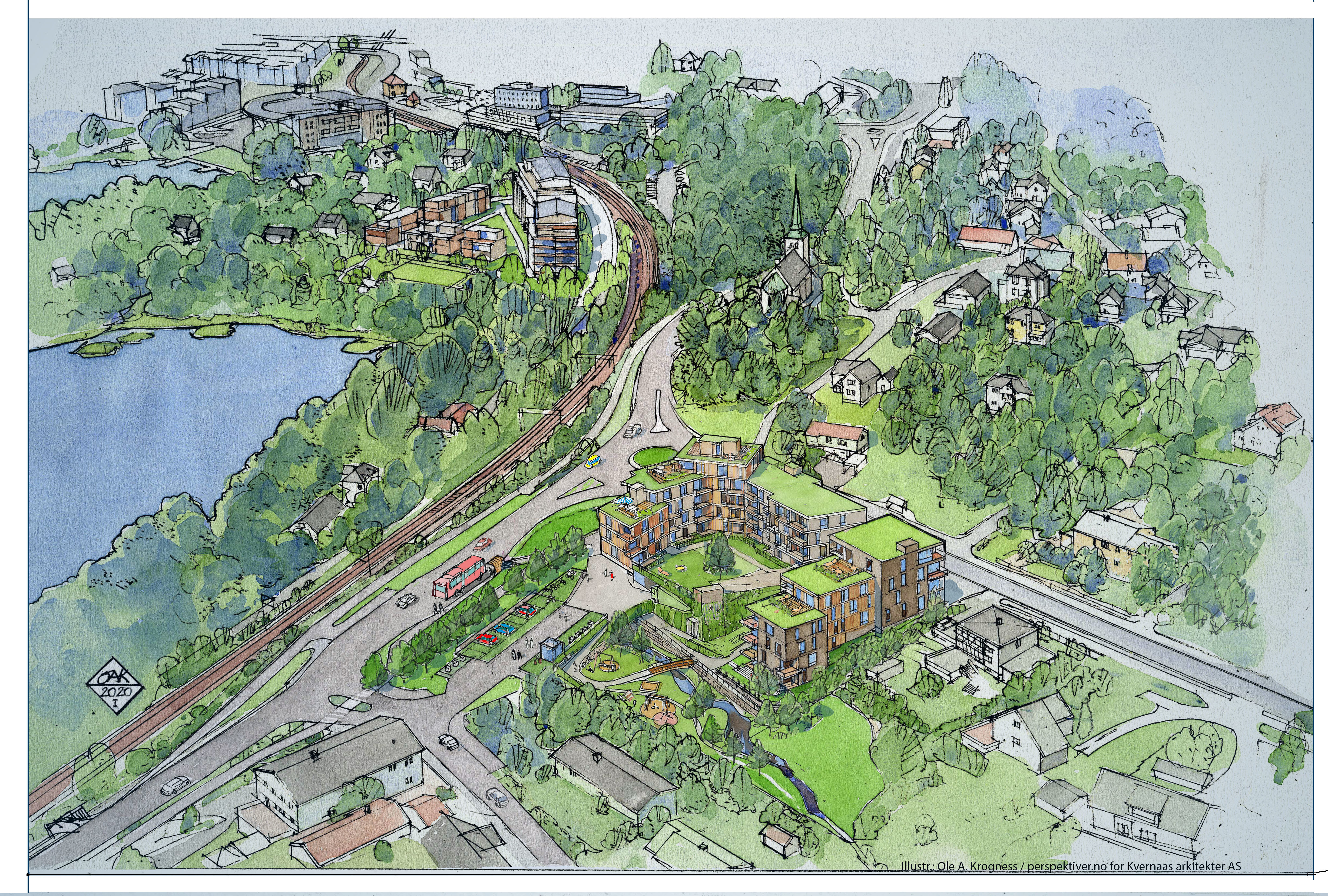 Det tilrettelegges for ca 48 boenheter i bebyggelse organisert rundt et skjermet gårdsrom. På nedre nivå etableres dagligvarebutikk og andre mindre næringsvirksomheter, og hovedmengden av parkeringen legges under terreng. Boligene organiseres i volumer med ulike høyder, avtrappet og terrassert ned til skråningen som åpner seg mot Skredderstubekken i sydvest. Bebyggelsens karakter og konsept fremkommer som et resultat av et ønske om variasjon, der hvert volum fremstår som enkelthus som lenkes i hverandre. De ulike volumene har fasadematerialer i enten tegl eller tre. Private uteplasser og balkonger er delvis trukket inn i og stikker delvis utenfor fasadelivet. Næringsarealet blir liggende i en underetasje og delvis under terreng der taket blir gårdsrommet til boligene over. Taket formes som landskap med en skråning som strekker seg ned til uteområdet ved Skredderstubekken. Skredderstubekken med tilliggende områder opparbeides parkmessig for lek og opphold.