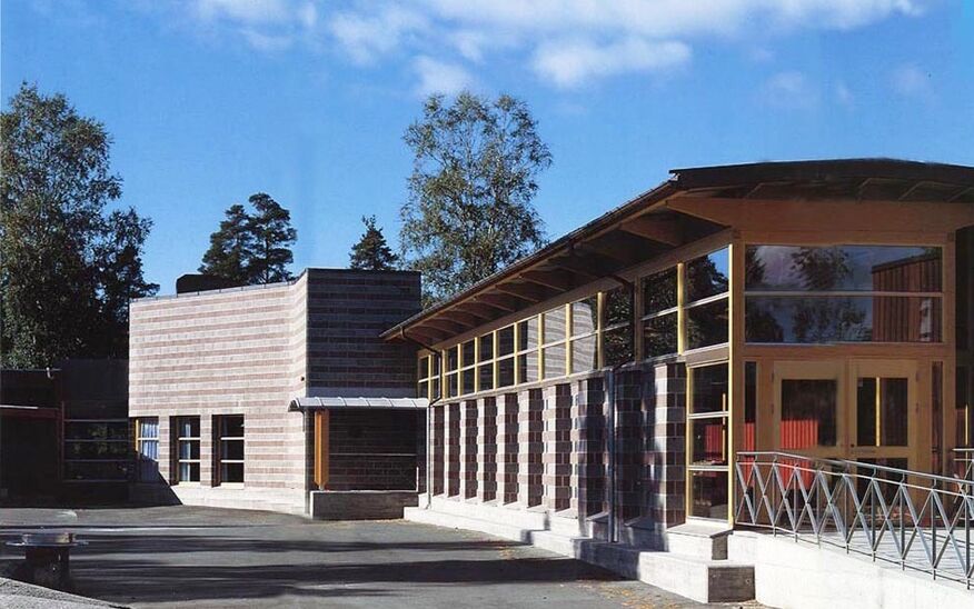 Tilbygget fremstår med egenkarakter i et forsøk på å tilføre et ellers stramt og lineært bygningsanlegg nye kvaliteter med en enhetlig og sterk form. Samtidig er strukturen i 60-tallets elementbyggeri forsøkt videreforedlet ved en rendyrking av et av de minste bygningselementene, lecablokken, både som element, konstruksjon og overflate. Lecafarget blokk ble benyttet for å dyrke kontrasten mellom den vertikale og horrisontale linjen.