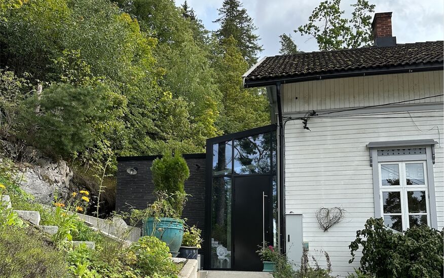 Oppgaven besto å gi eneboligen på Svartskog et tilgjengelig inngangsparti samt soverom og bad på hovedplanet. Tilbygget ble plassert på baksiden - på den opprinnelige inngangssiden. Fram til inngangen ble det etablert en ny rampe - integrert i terrenget for trinnfri atkomst. Tiltaket gir mulighet for at hele hovedplanet blir tilgjengelig. Addisjonen er gitt en moderne form, som på inngangssiden fremstår to-delt: Ét "åpent" mellombygg i glass som tar opp i seg det opprinnelige inngangs-takets form med et skråstilt glasstak, og én tett del med i mørkbrent tegl mot den bratte skråningen.