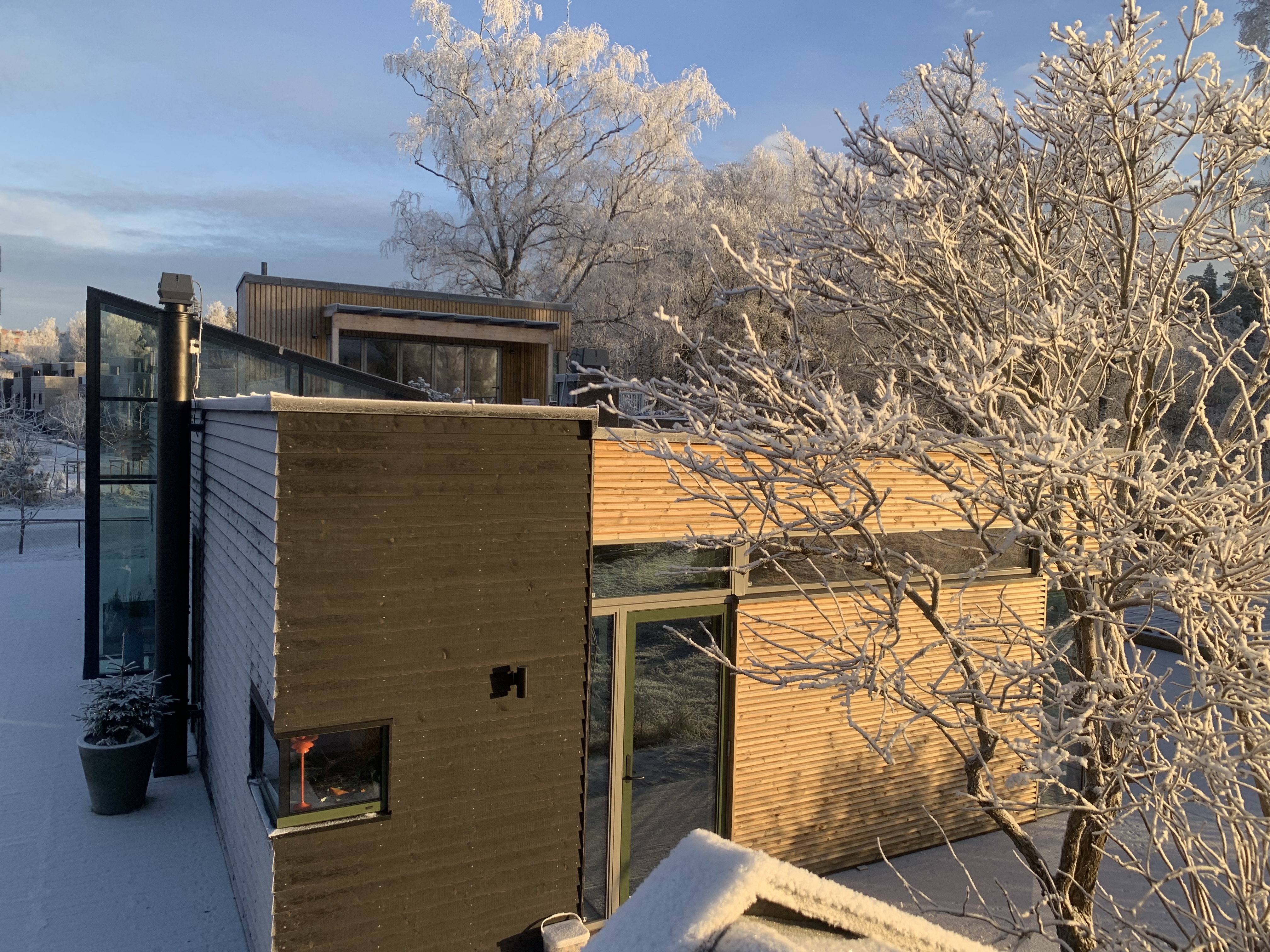 Fasaden spiller på 4 ulike kledningstyper som fremhever husets ytre side mot veien i kontrast til innsiden, dvs. hagesiden. Kontraster i vindusformater og komposisjon mellom tette mot åpne volumer, horisontale og vertikale elementer skaper husets arkitektoniske uttrykk. Huset er en respektfull kontrast til Liljevik – lave volumer i god avstand, og har en naturlig fargepallett som ikke vil konkurrere med det gamle, hvite huset. Innvendige oppholdsrom og gangsoner er kledd med lys, ubehandlet ospepanel.
