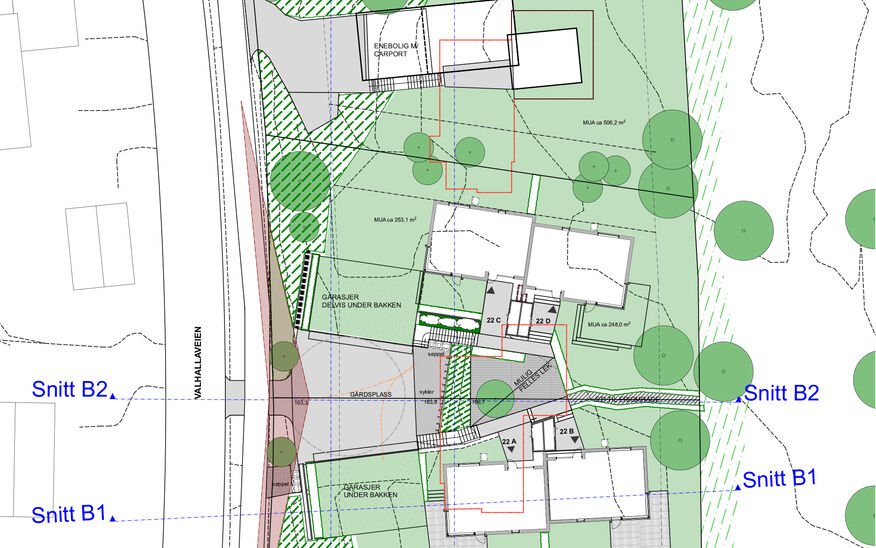 Oppdragsgiver kjøpte naboeiendommen og vil utvikle de to tomtene til 2 tomannsboliger og ny enebolig. Tomten ligger vestvendt med fall ned mot Valhallaveien. Tomannsboligtomtene får felles adkomst og parkeringsanlegg mot veien. Parkering og garasjer må sprenges ned i terreng for å tilfredstille stigningskrav til adkomst. Dette gir anledning til å benytte garasjetakene til verdifullt uteoppholdsareal. Det er vesentlig å tilrettelegge for et godt bomiljø med en klar nabolagsprofil, felles opphold for lek og samtidig sørge for solrike, private uteplasser for alle. Tomannsboligene får inngang fra tunet og boligene har derfor en planløsning som med enkle grep kan speiles om den sentriske trappen. Alle boligene har oppholdssoner i 1. etasje med utgang til terreng.