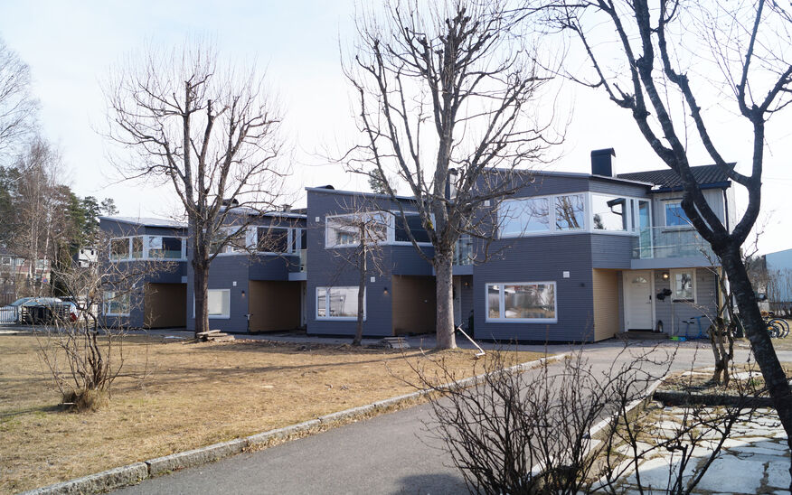 Tyribo Sameie på Hellerasten består av syv rekkehus fra 60-tallet. Vi fikk i oppgave å lage en prototype for et arealeffektivt tilbygg med et minimalt fotavtrykk. Reguleringsplanen ga tilgang til å utvide hver bolig med maksimalt 21 m2. Løsningen ble et to-etasjers tilbygg på inngangssiden som gir et ekstra soverom i 1.etg og en utvidelse av kjøkkenet i 2.etasje.