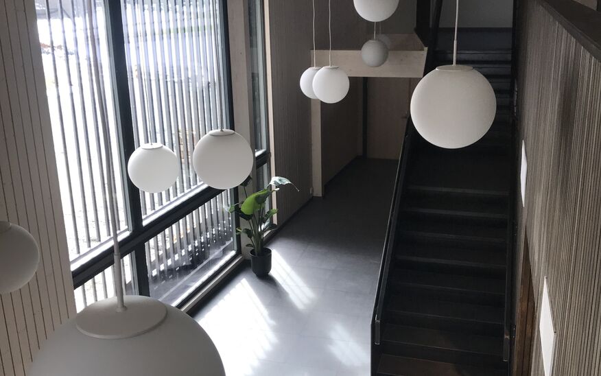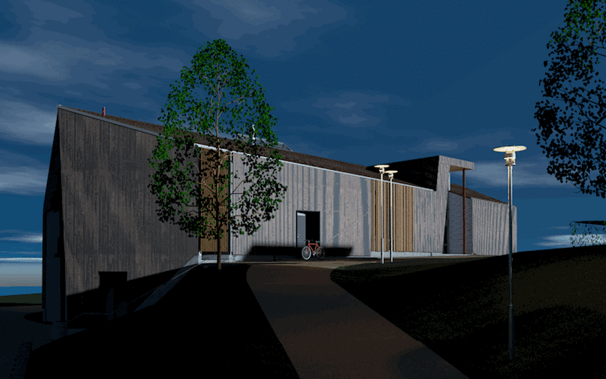Utfordringen var å tilpasse et relativt stort volum og en ny funksjon til et tradisjonelt gårdstun. Huset er gitt en ny og utfordrende form med spisst avsluttede gavler, men en tradisjonelt oppsluttende saltaksform med en markant takvinkel. Saltak og langvegger har en mørk kledning som minner om låvepanel. Som kontrast til den omsluttende og lukkede rammen, åpner gavlene mot nord og sør seg med store glassflater og balkonger. Det er gitt stor vekt på tradisjonelle materialer med høy kvalitet, men med nye, røffe løsninger. Slik gir dagens formspråk et tilskudd til det tradisjonsrike tunet.