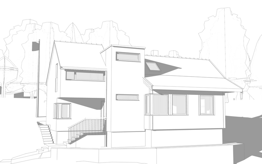 Tilbygget kobler seg til husets gavl med det nye inngangspartiet som et bindeledd og mellomsone mellom to hovedvolum. Takflaten på sydsiden er en forlengelse av eksisterende tak, men med et takopplett mot nord, som gir plass til badet, fremstår det tydelig som et mellombygg. I et høyere bygningsvolum er det blitt plass til lyse og luftige soverom. Trappen i mellomsonen skal erstatte eksisterende «hønsestige» til loftsetasjen fra stuen.