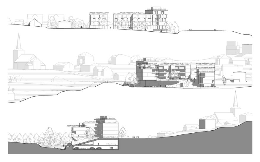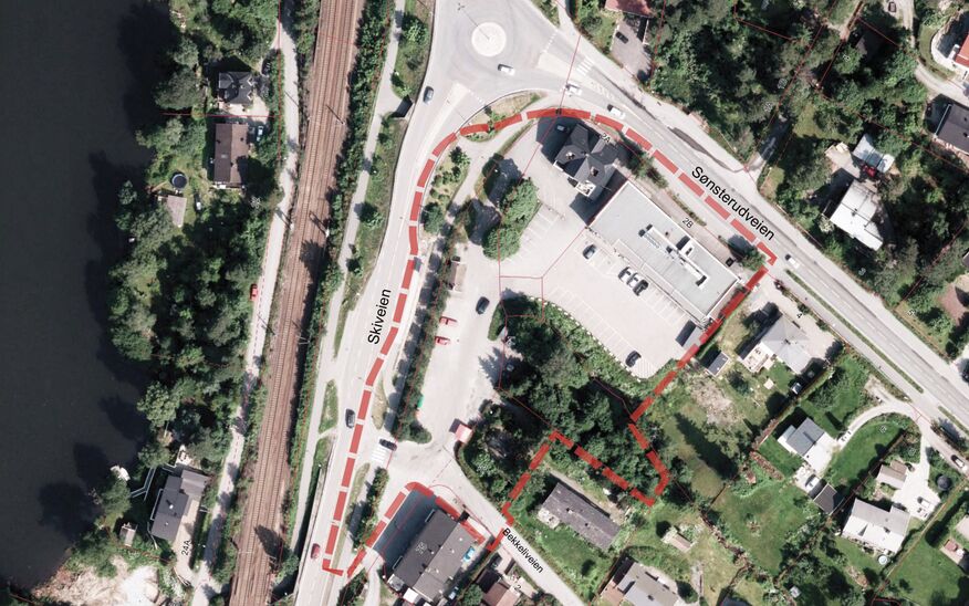 Det tilrettelegges for ca 48 boenheter i bebyggelse organisert rundt et skjermet gårdsrom. På nedre nivå etableres dagligvarebutikk og andre mindre næringsvirksomheter, og hovedmengden av parkeringen legges under terreng. Boligene organiseres i volumer med ulike høyder, avtrappet og terrassert ned til skråningen som åpner seg mot Skredderstubekken i sydvest. Bebyggelsens karakter og konsept fremkommer som et resultat av et ønske om variasjon, der hvert volum fremstår som enkelthus som lenkes i hverandre. De ulike volumene har fasadematerialer i enten tegl eller tre. Private uteplasser og balkonger er delvis trukket inn i og stikker delvis utenfor fasadelivet. Næringsarealet blir liggende i en underetasje og delvis under terreng der taket blir gårdsrommet til boligene over. Taket formes som landskap med en skråning som strekker seg ned til uteområdet ved Skredderstubekken. Skredderstubekken med tilliggende områder opparbeides parkmessig for lek og opphold.