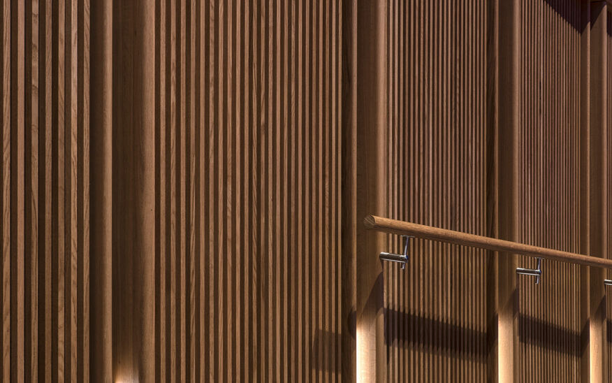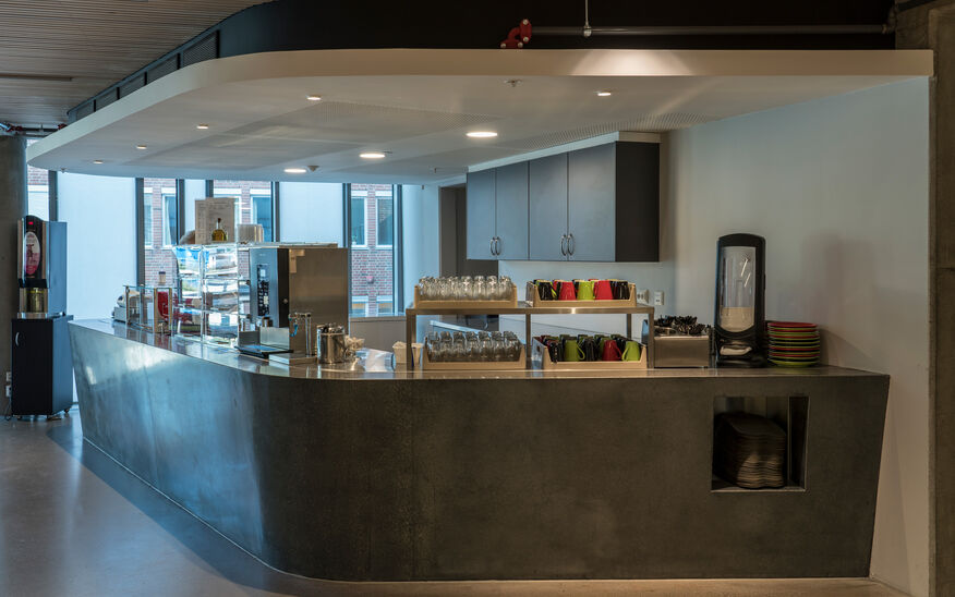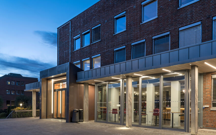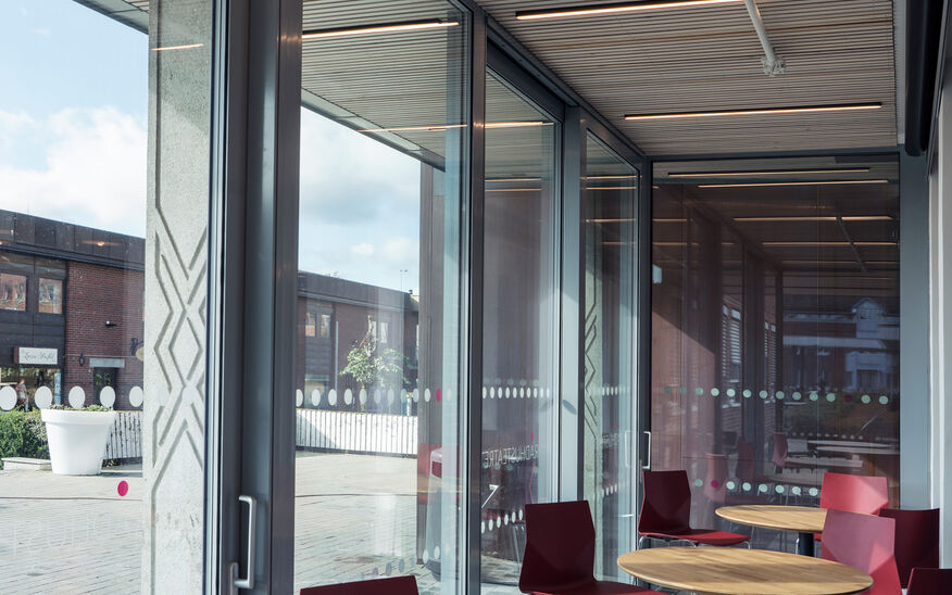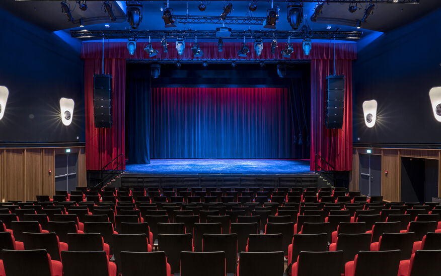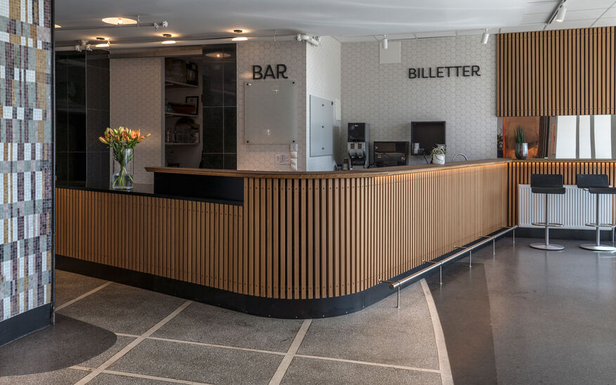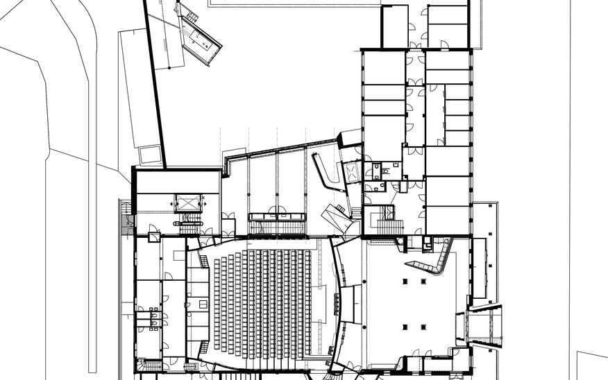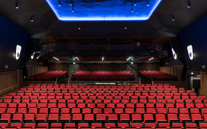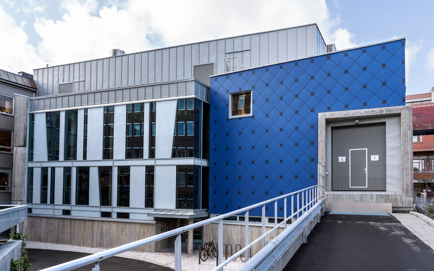 Sidescenen er tydelig i sin form - «den blå boksen», og resten av tilbygget har glassfasade mot gårdsplassen, hvor halvparten av glasset er utført i aerogel med gode isolasjonsegenskaper, samt at det slipper inn og sprer lys.
