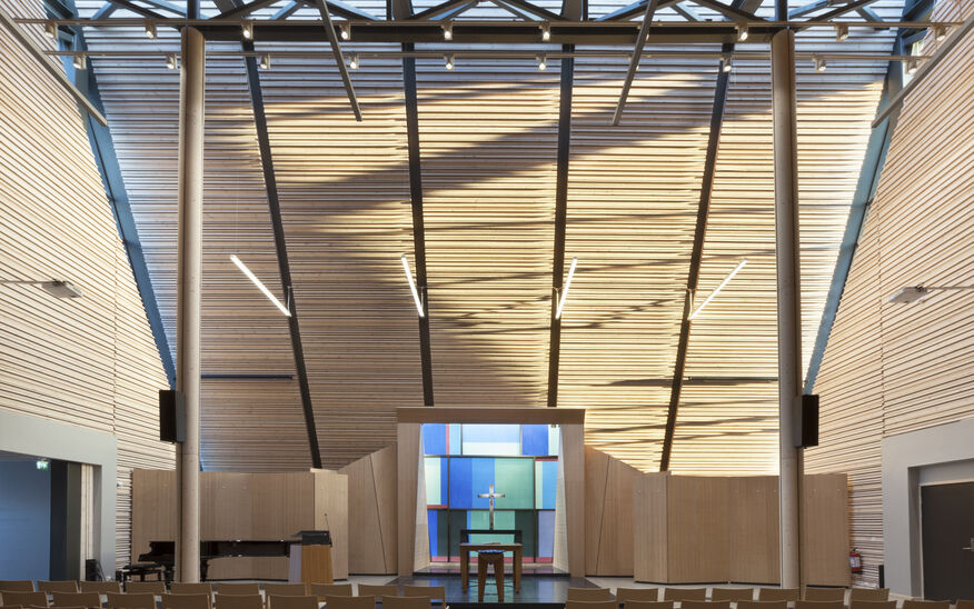 Variert dagslysinnfall, spalter, integrert kunst, og apsidens fondmotiv har vært sentrale temaer i forbindelse med utformingen av anlegget. Kirkearealet består av kirkesalen med galleri og to tilliggende saler, kirketorg med peisestue, messanin, møteavdeling og kjøkken.