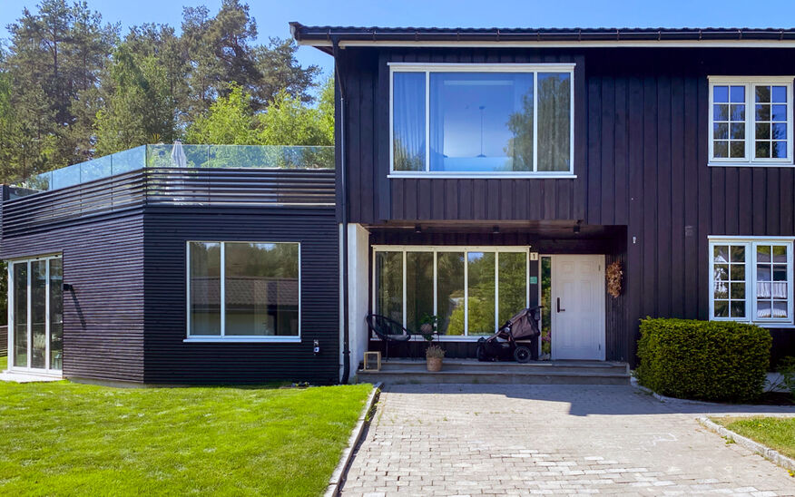 Vi fikk i oppgave å tegne et tilbygg med hagestue, ett soverom, arbeidsrom og bad, i tillegg til å forbedre garderobesituasjonen.