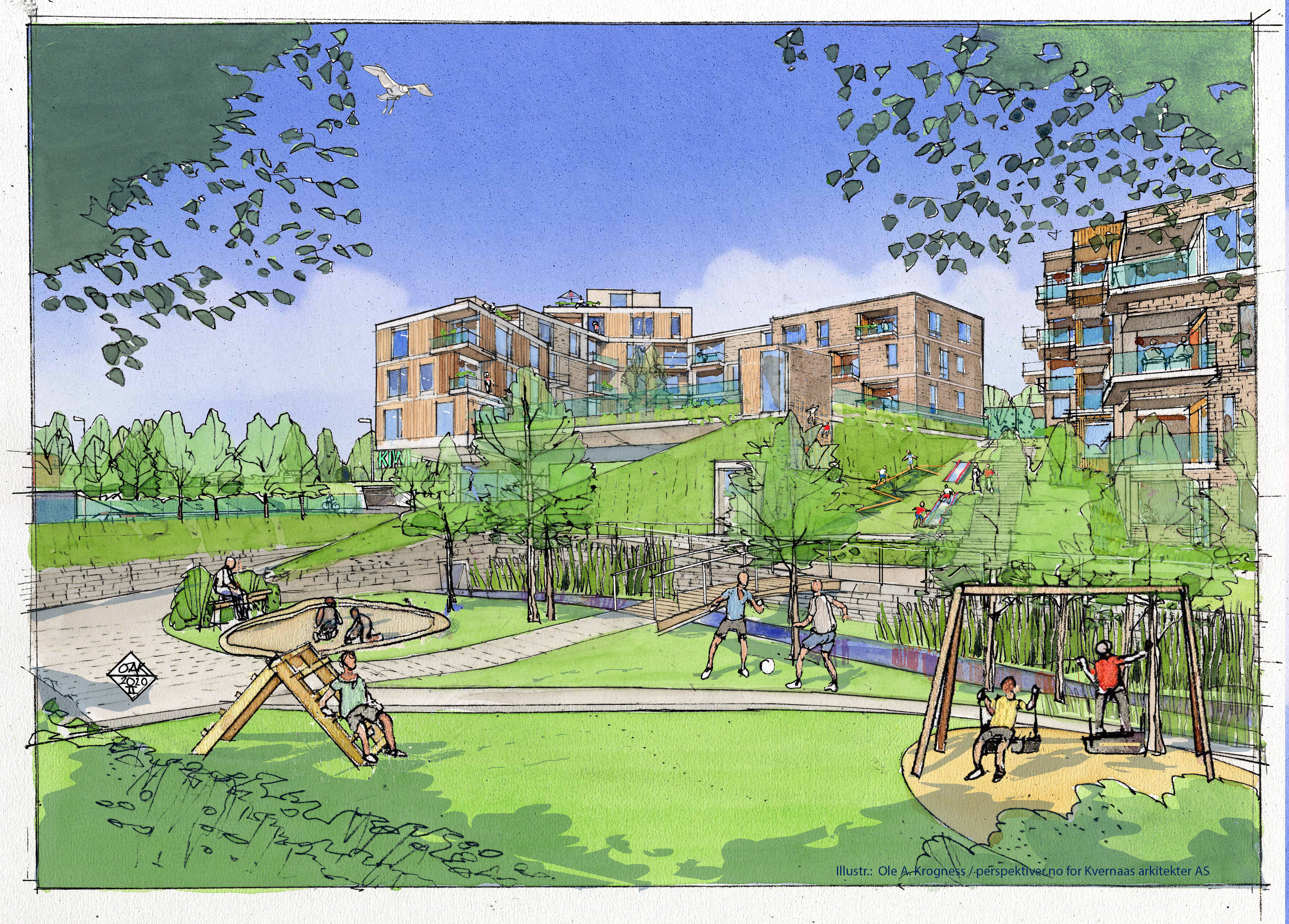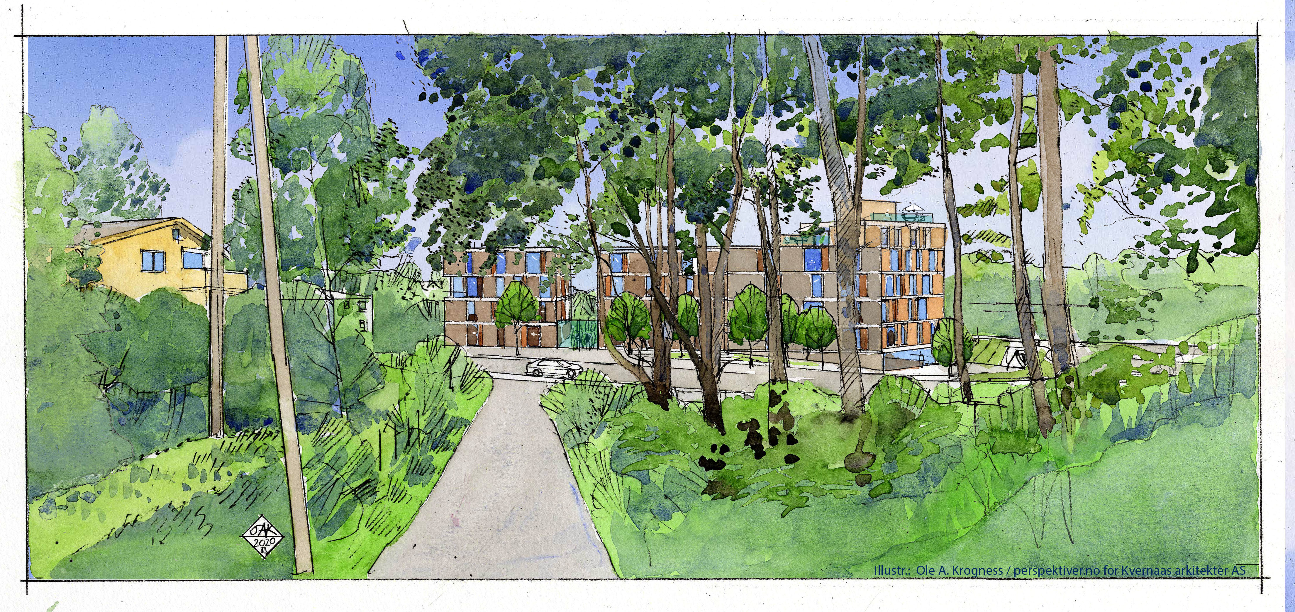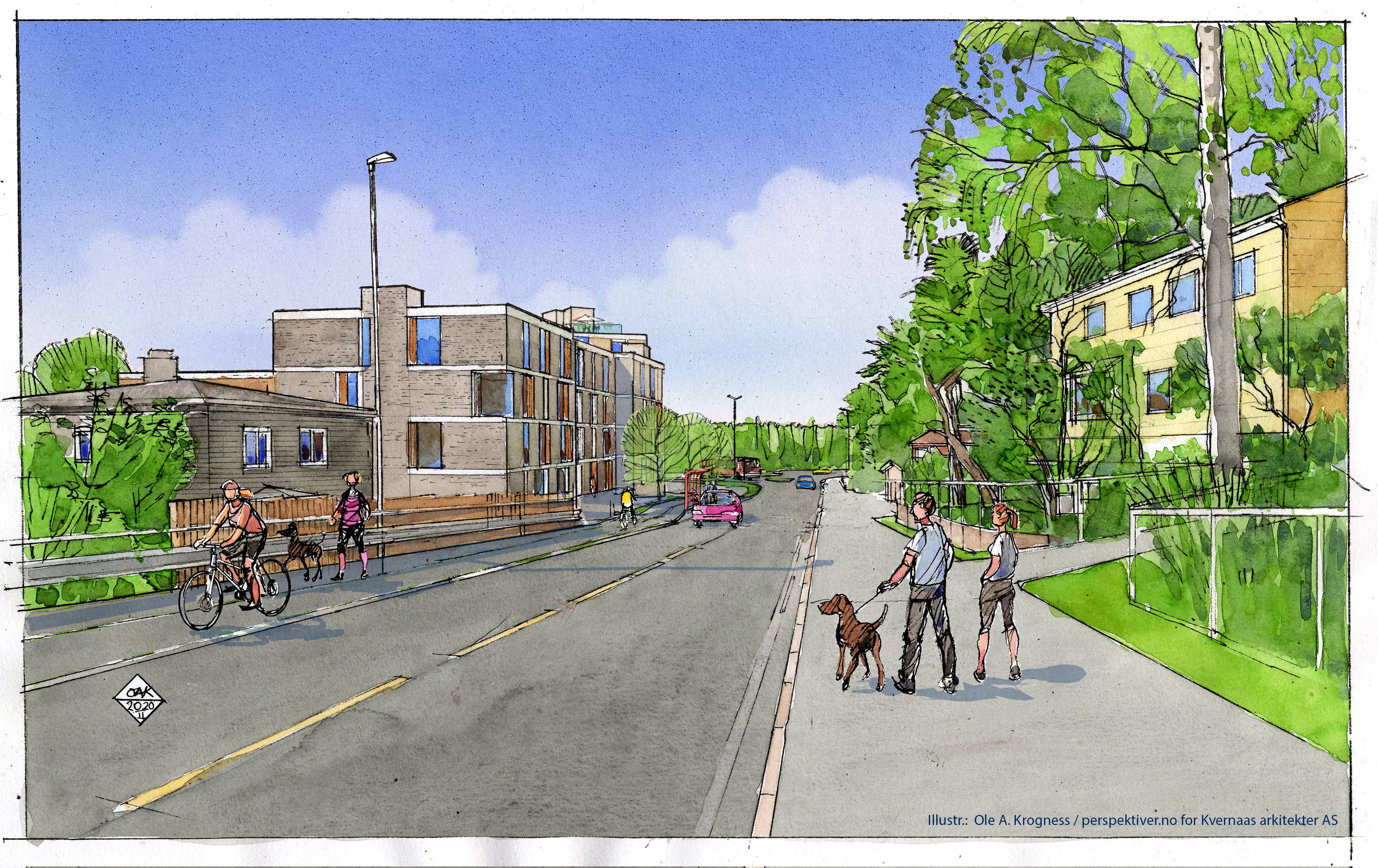 Det tilrettelegges for ca 48 boenheter i bebyggelse organisert rundt et skjermet gårdsrom. På nedre nivå etableres dagligvarebutikk og andre mindre næringsvirksomheter, og hovedmengden av parkeringen legges under terreng. Boligene organiseres i volumer med ulike høyder, avtrappet og terrassert ned til skråningen som åpner seg mot Skredderstubekken i sydvest. Bebyggelsens karakter og konsept fremkommer som et resultat av et ønske om variasjon, der hvert volum fremstår som enkelthus som lenkes i hverandre. De ulike volumene har fasadematerialer i enten tegl eller tre. Private uteplasser og balkonger er delvis trukket inn i og stikker delvis utenfor fasadelivet. Næringsarealet blir liggende i en underetasje og delvis under terreng der taket blir gårdsrommet til boligene over. Taket formes som landskap med en skråning som strekker seg ned til uteområdet ved Skredderstubekken. Skredderstubekken med tilliggende områder opparbeides parkmessig for lek og opphold.
