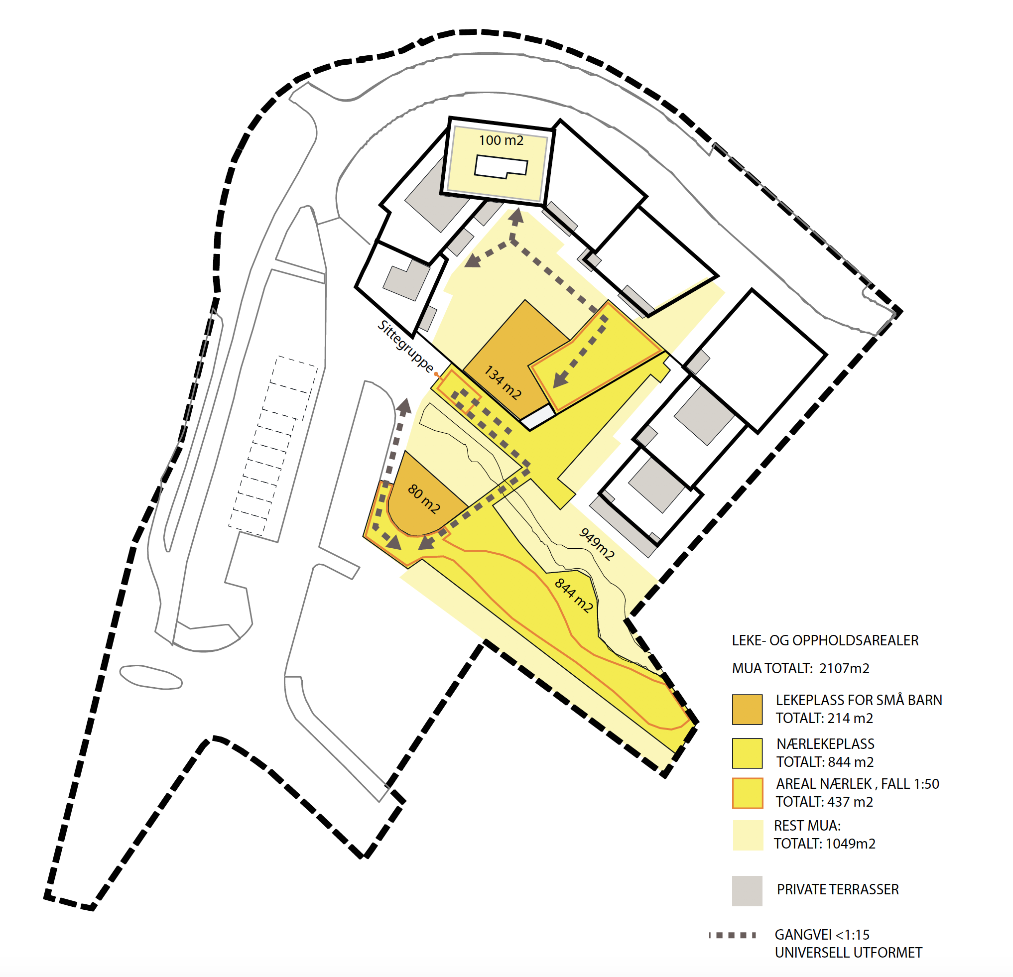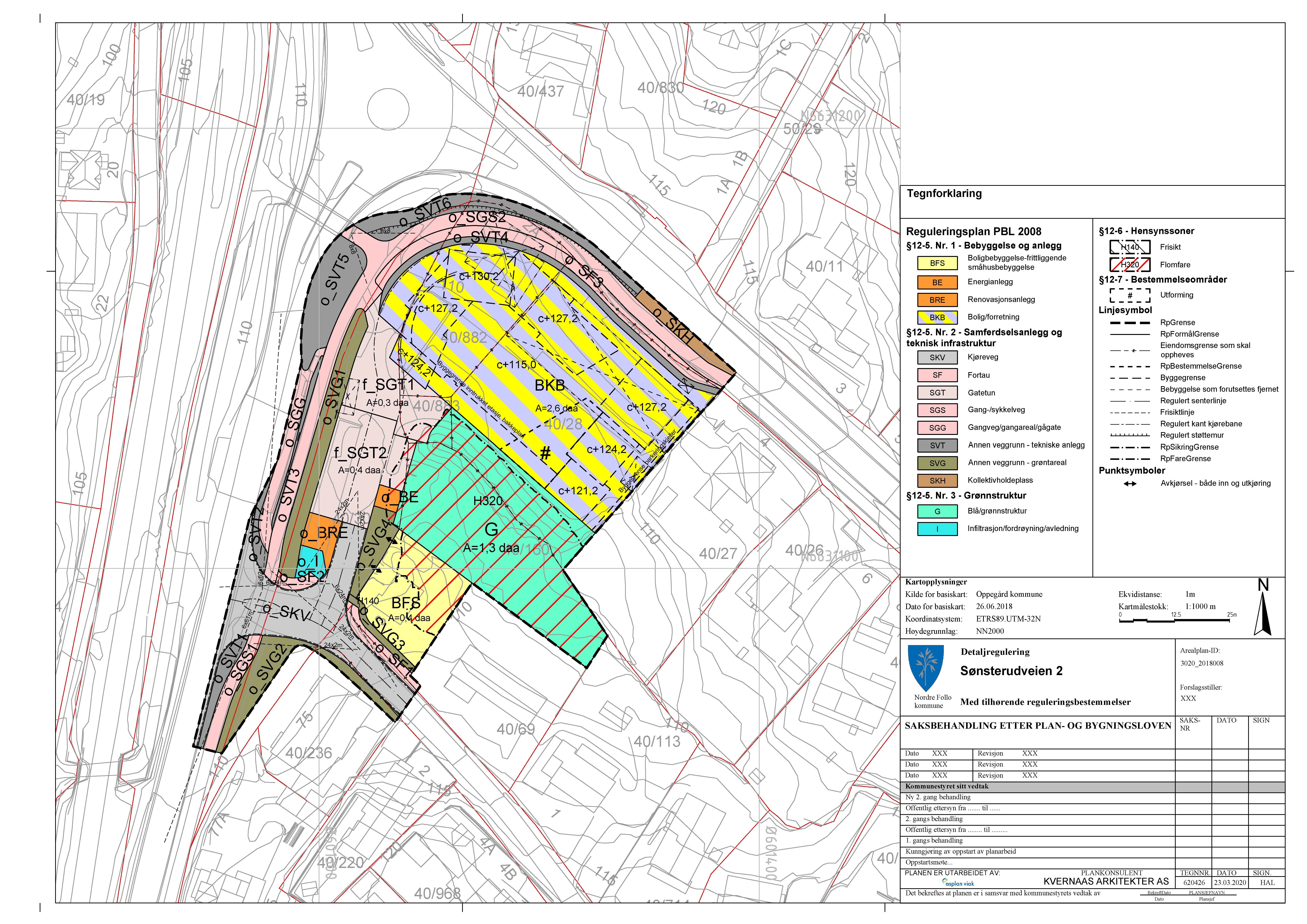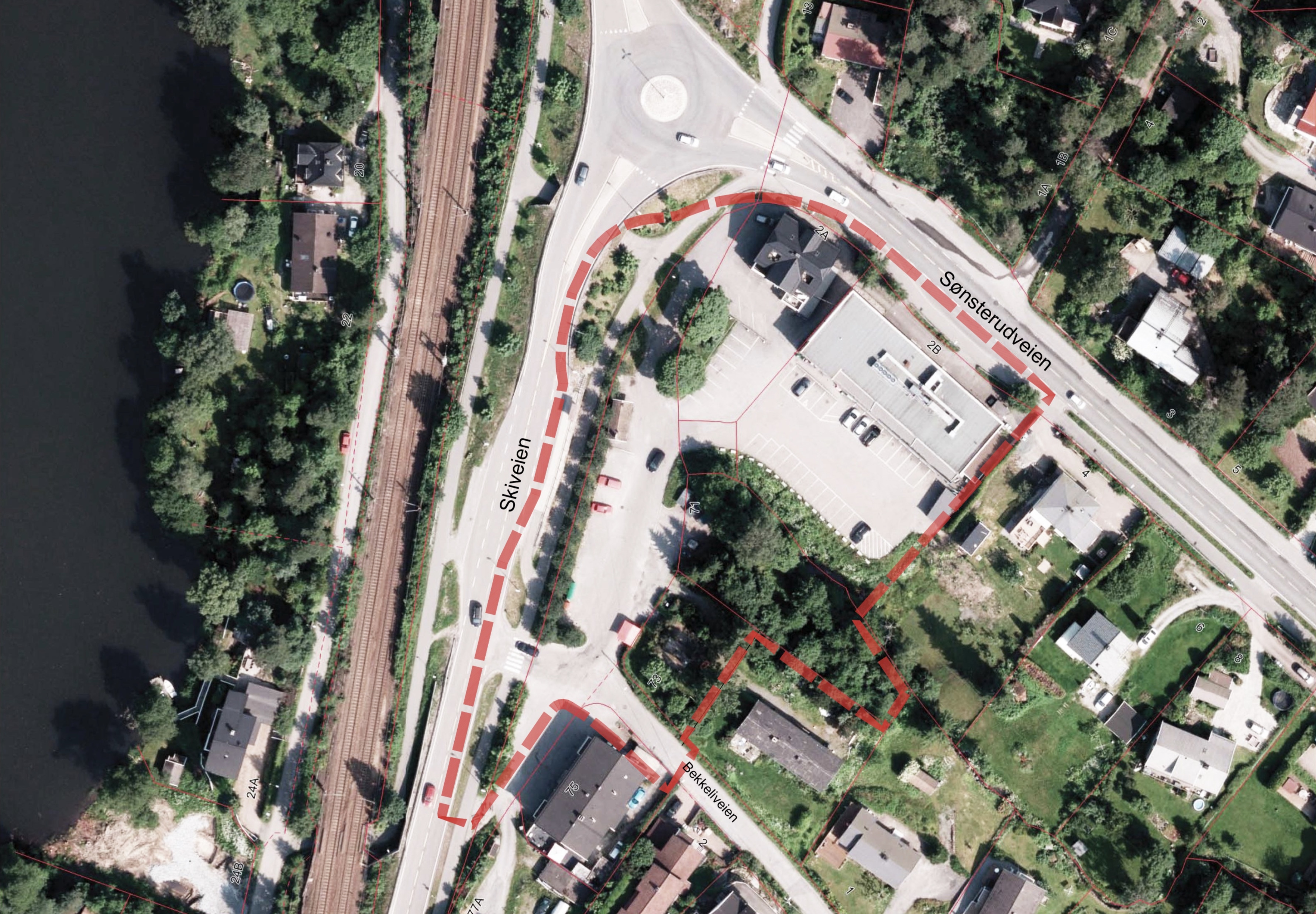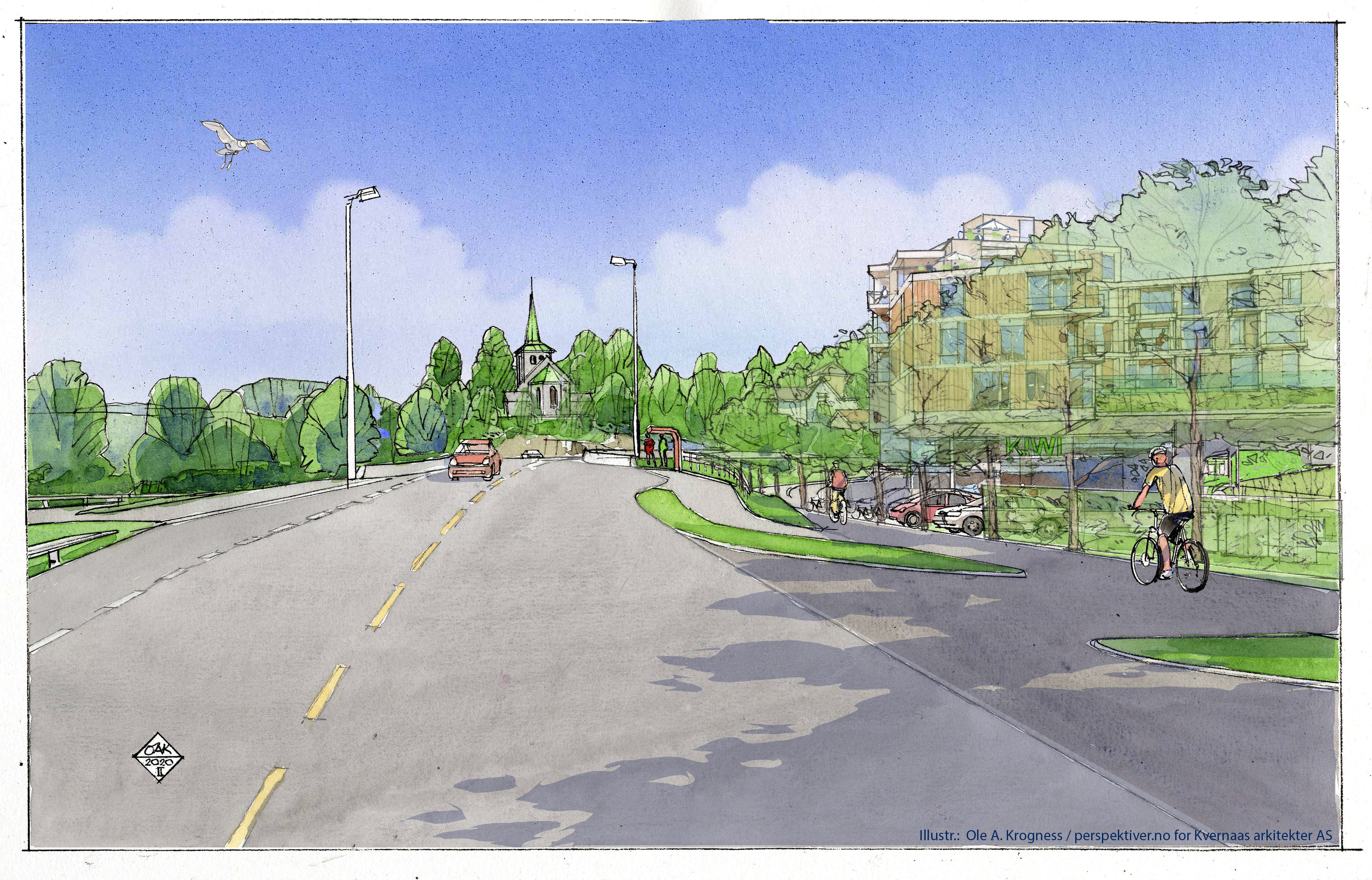 Det tilrettelegges for ca 48 boenheter i bebyggelse organisert rundt et skjermet gårdsrom. På nedre nivå etableres dagligvarebutikk og andre mindre næringsvirksomheter, og hovedmengden av parkeringen legges under terreng. Boligene organiseres i volumer med ulike høyder, avtrappet og terrassert ned til skråningen som åpner seg mot Skredderstubekken i sydvest. Bebyggelsens karakter og konsept fremkommer som et resultat av et ønske om variasjon, der hvert volum fremstår som enkelthus som lenkes i hverandre. De ulike volumene har fasadematerialer i enten tegl eller tre. Private uteplasser og balkonger er delvis trukket inn i og stikker delvis utenfor fasadelivet. Næringsarealet blir liggende i en underetasje og delvis under terreng der taket blir gårdsrommet til boligene over. Taket formes som landskap med en skråning som strekker seg ned til uteområdet ved Skredderstubekken. Skredderstubekken med tilliggende områder opparbeides parkmessig for lek og opphold.