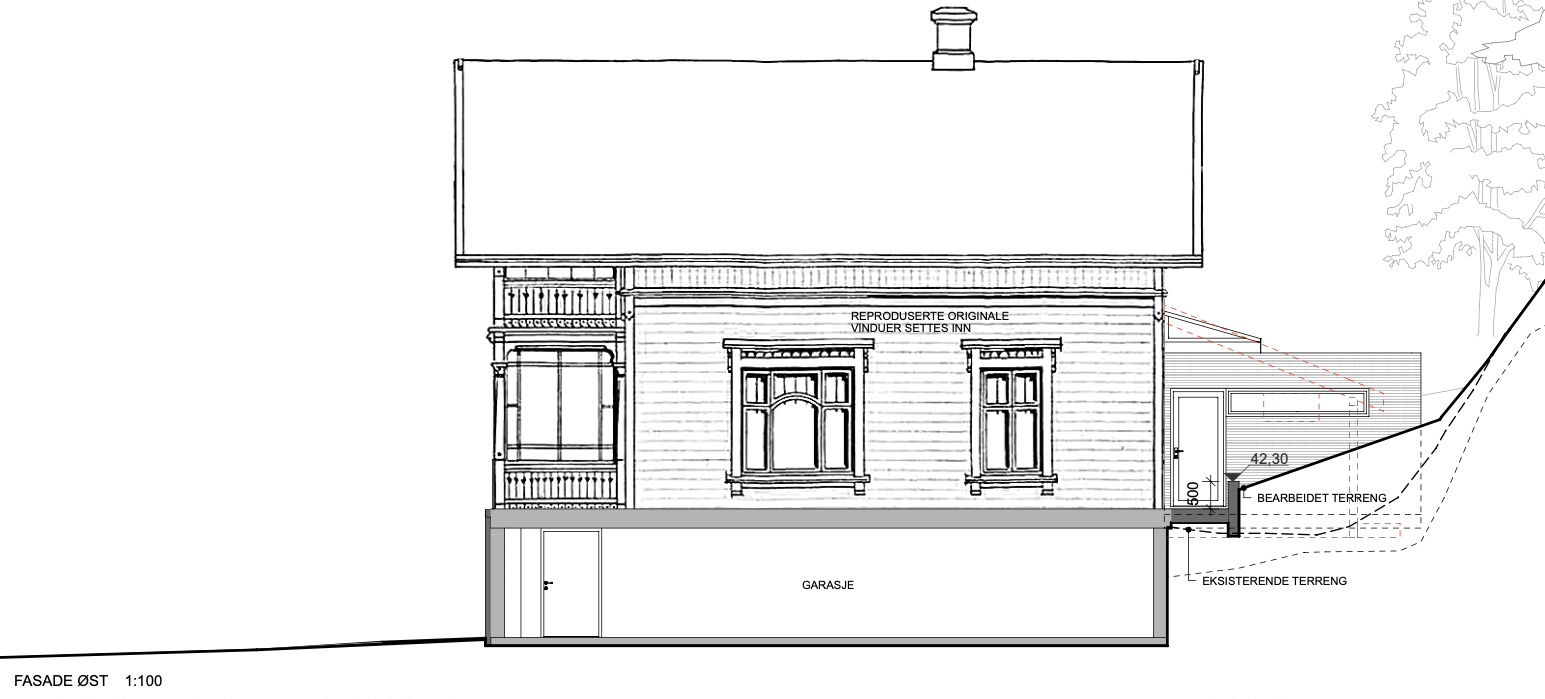 Det opprinnelige inngangspartiet var gjenbygget og endret på et senere tidspunkt. Derfor ble det valgt rive det meste av dette ombygde tilbygget, men beholde konstruksjonen i det opprinnelige inngangspartiet. De profilerte sveitserstilssøylene og dragerne inngår her som et fritt og synlig element i det nye tilbygget.