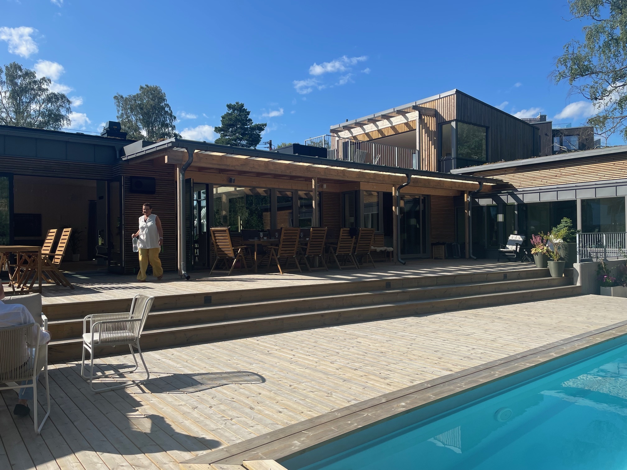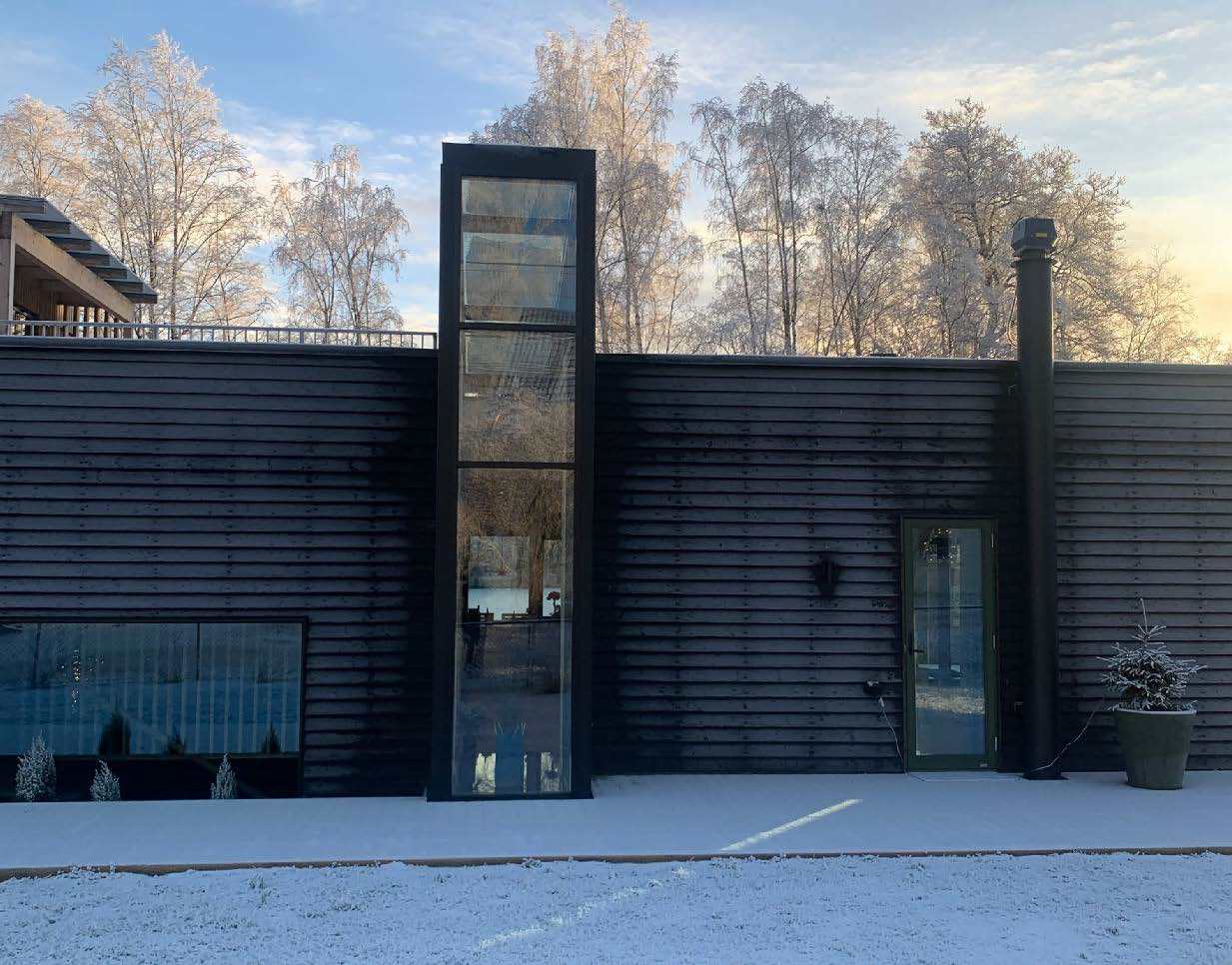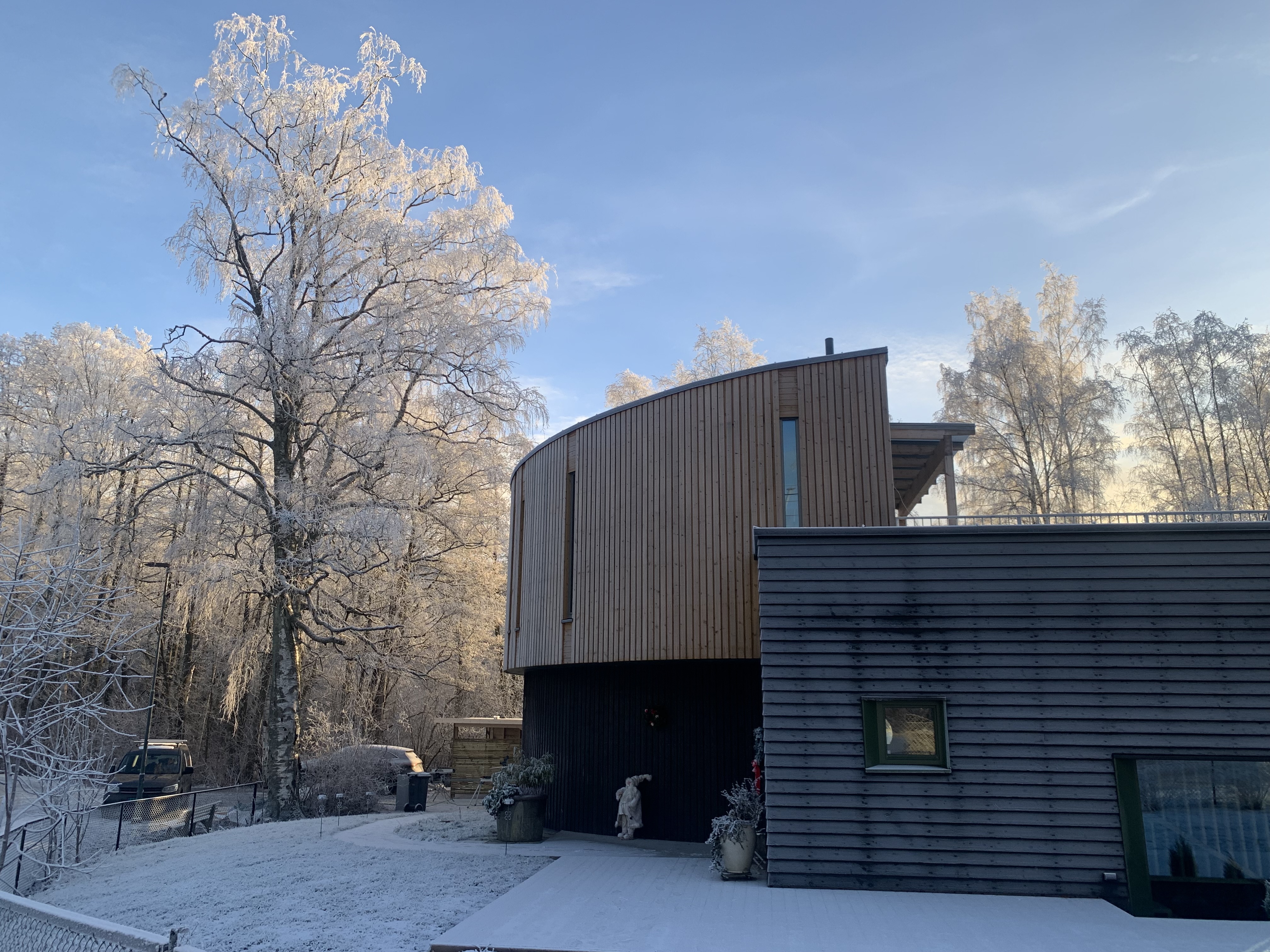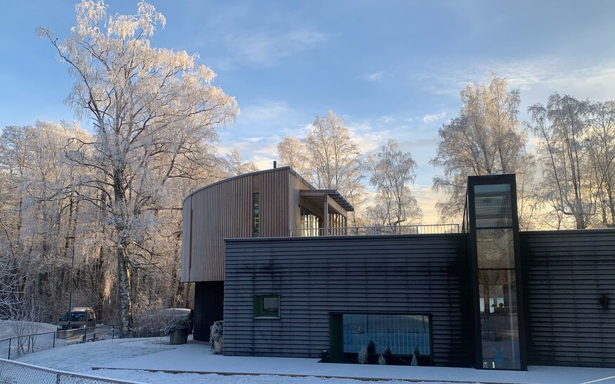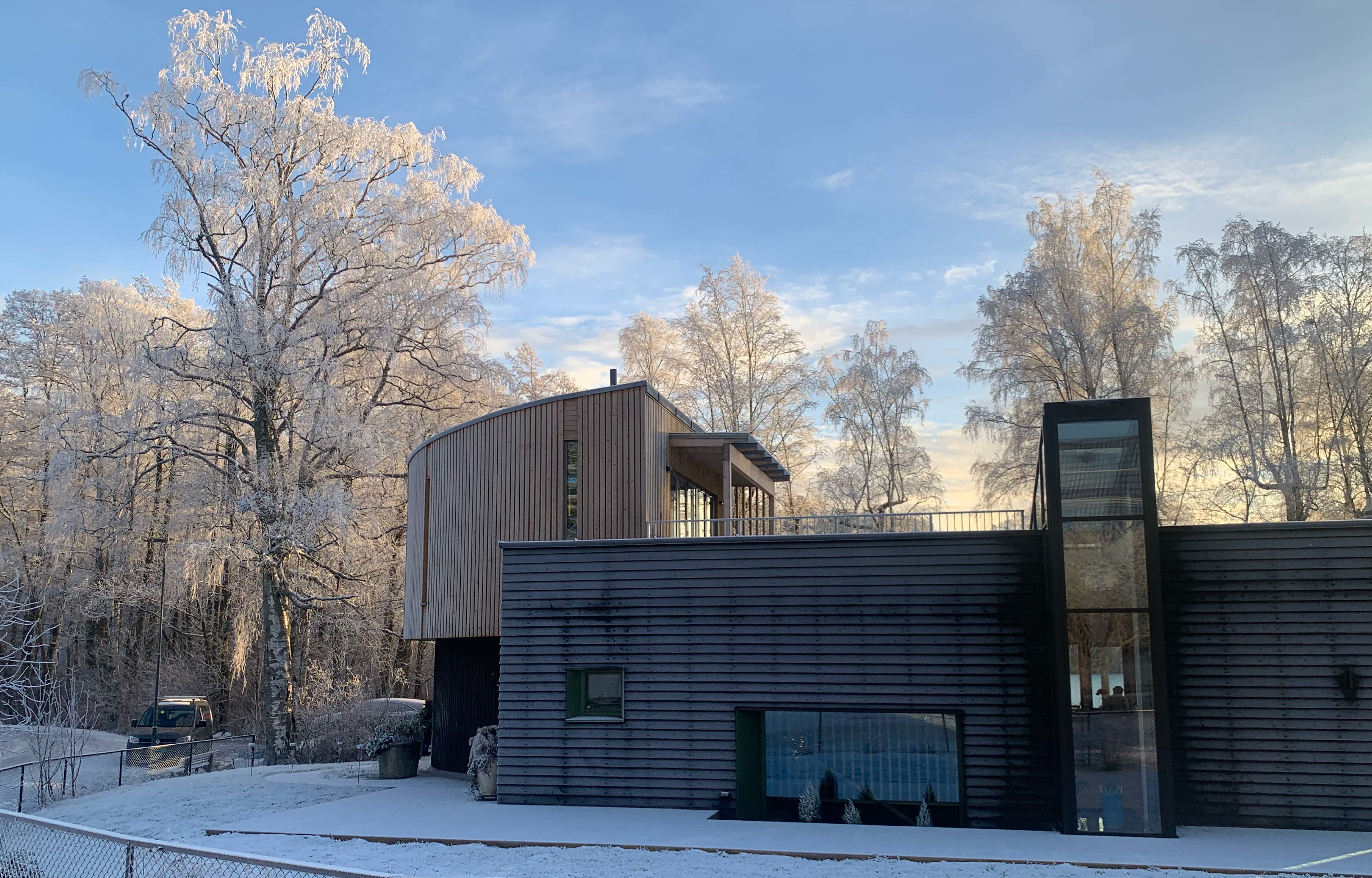 Fasaden spiller på 4 ulike kledningstyper som fremhever husets ytre side mot veien i kontrast til innsiden, dvs. hagesiden. Kontraster i vindusformater og komposisjon mellom tette mot åpne volumer, horisontale og vertikale elementer skaper husets arkitektoniske uttrykk. Huset er en respektfull kontrast til Liljevik – lave volumer i god avstand, og har en naturlig fargepallett som ikke vil konkurrere med det gamle, hvite huset. Innvendige oppholdsrom og gangsoner er kledd med lys, ubehandlet ospepanel.