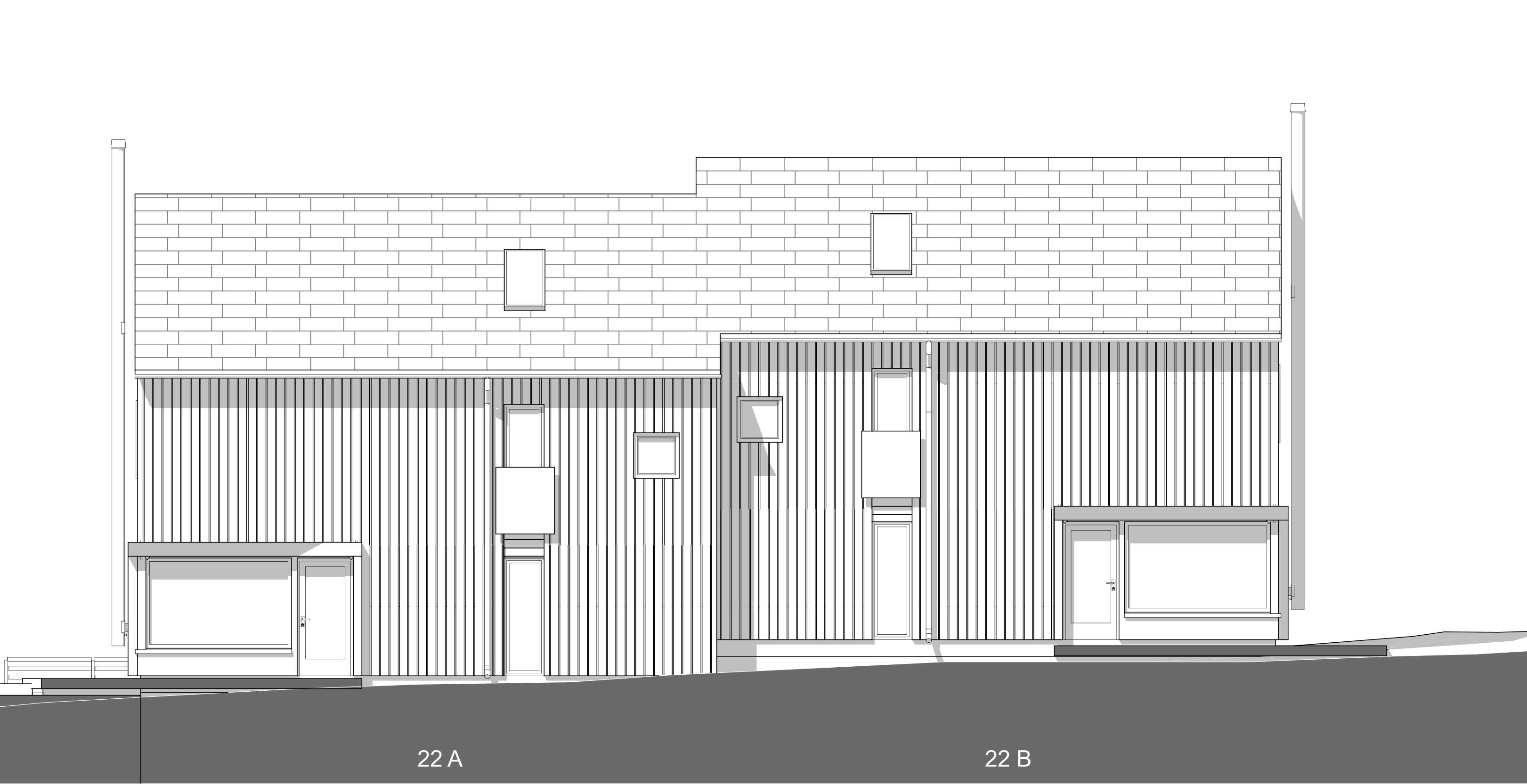 Tomannsboligene har tradisjonell saltaksform og trekledning, men med skarp takvinkel og knappe takutstikk fremstår boligene som moderne, men solide.
