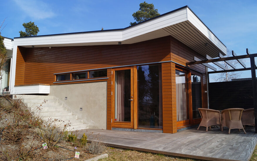Hovedboligen er et typisk 60-talls trefunkishus med flatt tak og en tydelig horisontal gesimskasse. Tilbygget tar opp disse tydelige linjene, men på en mer dynamisk måte ved å gi det en vinkel som følger terrengretningen, for så å vippe seg opp igjen. Slik er det skapt et uttrykk fra vår tid, samtidig som at det knytter seg til det eksisterende huset uten at det har blitt endret.