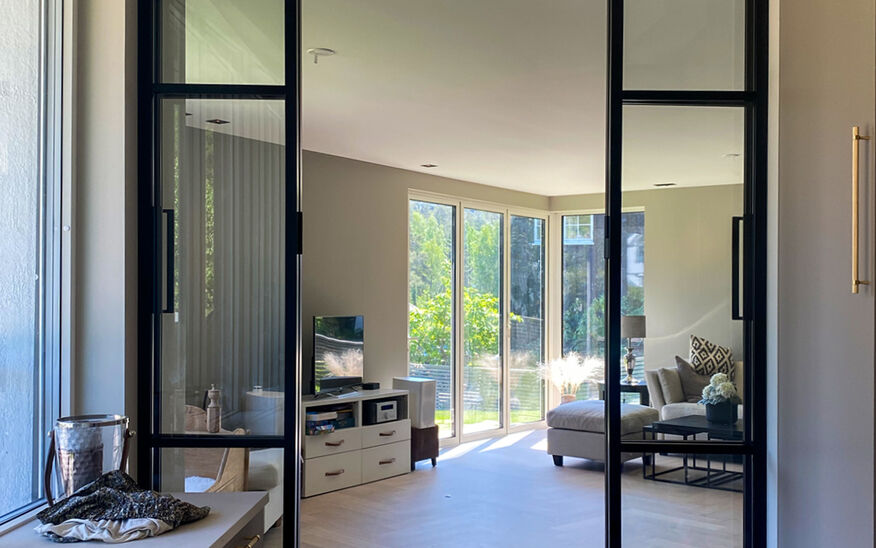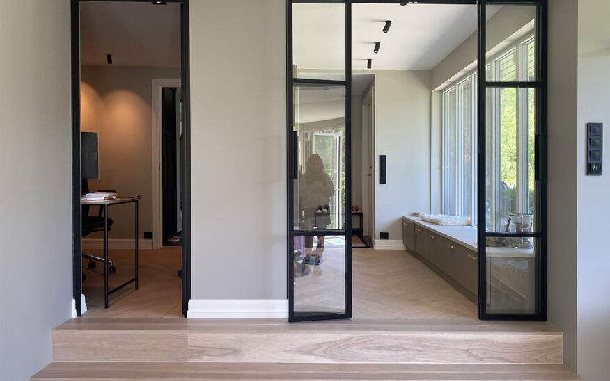 Vi fikk i oppgave å tegne et tilbygg med hagestue, ett soverom, arbeidsrom og bad, i tillegg til å forbedre garderobesituasjonen.
