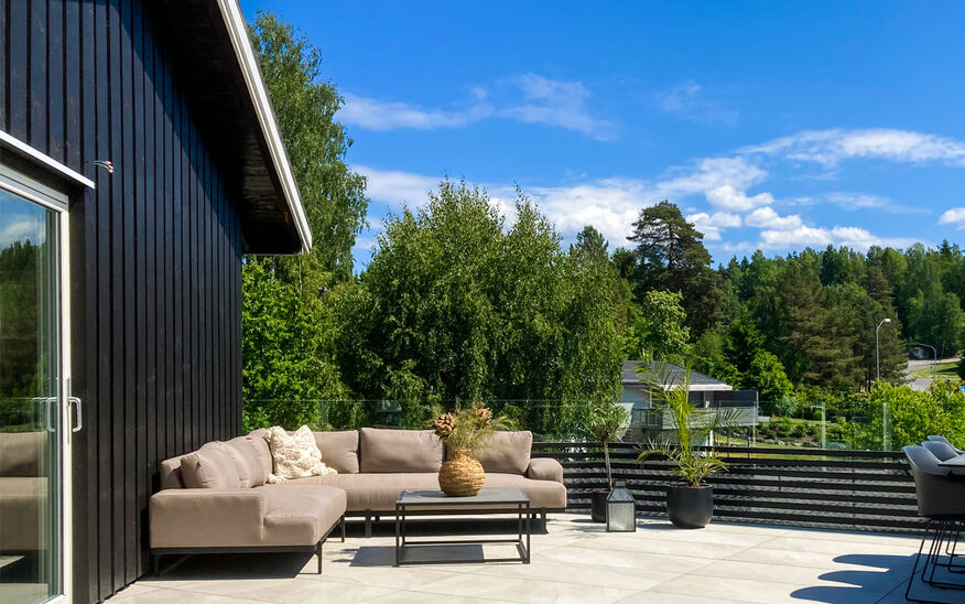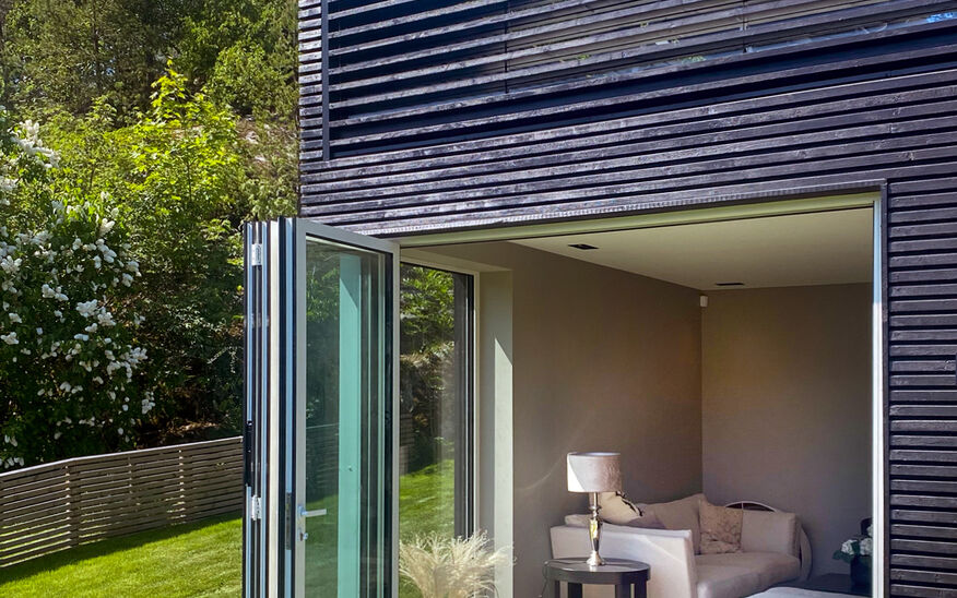 Det var ønskelig med terrasse på taket med direkte utgang fra stuen i 1.etasje. Løsningen ble et tilbygg på ca. 50 m2 mot syd. Boligen er én av de første man møter ved atkomsten til Ingieråsen boligområde. Det er nylig utarbeidet en plan for området med strenge krav til ny bebyggelse for å ivareta områdekarakteren med tidstypiske hus med høy arkitektonisk kvalitet. Alle tilbygg og ombygginger blir kulturminnefaglig vurdert. Det var derfor viktig å innlede en dialog med kommunen i innfasing av prosjektet med vurdering av alternativer. Løsningen ble et tilbygg som klart fremstår som en addisjon av vår tid, men som tar opp linjeføring, elementer og farge fra det opprinnelige huset. Tilbyggets geometri vinkles i forhold til orientering mot hage og uteplass og i forhold til nabobebyggelse og eiendomsgrense.