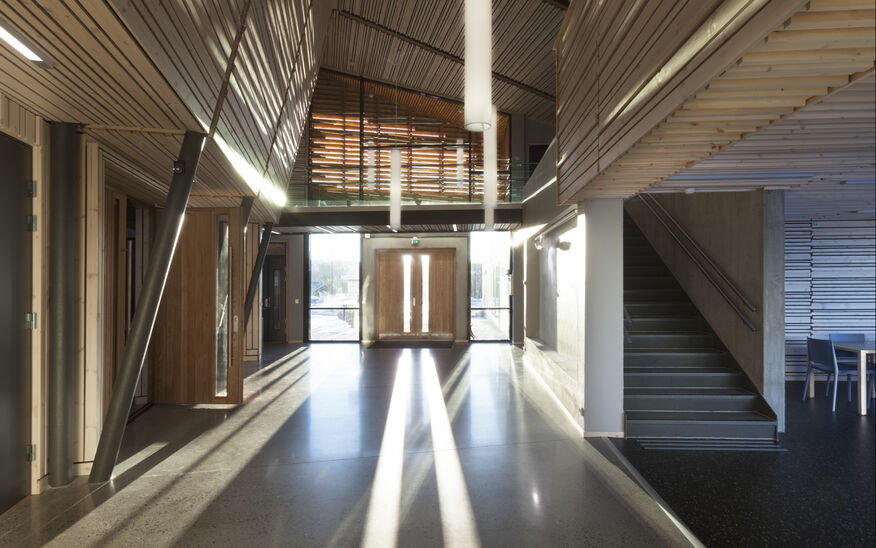 Kirkens hovedkonstruksjon er i stål, og den kraftige klimaveggen bidrar til å gjøre kirken til et energigjerrig bygg. Utvendig er det utstrakt bruk av malmfuru, som med sin særegne utforming og detaljering gir kirken identitet og gjenkjennelighet. Dagslys siver inn glassfeltene bak trespilene og gir rommet karakter og varmt lys. Interiøret preges av trekledning, pussflater og slipt betong i hovedgulv, linoleum i fløyene og eikeparkett for øvrig.