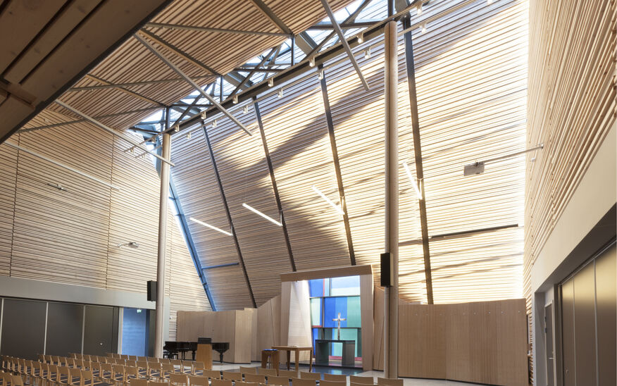Variert dagslysinnfall, spalter, integrert kunst, og apsidens fondmotiv har vært sentrale temaer i forbindelse med utformingen av anlegget. Kirkearealet består av kirkesalen med galleri og to tilliggende saler, kirketorg med peisestue, messanin, møteavdeling og kjøkken.