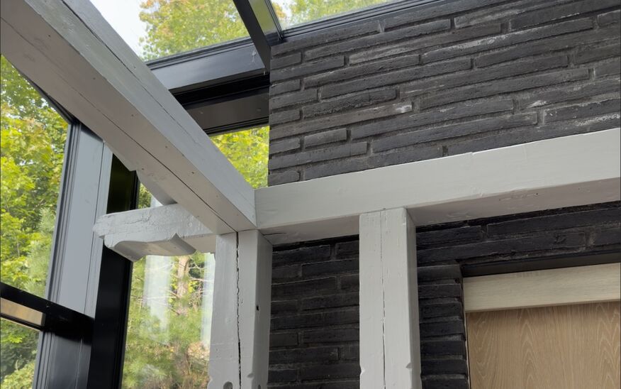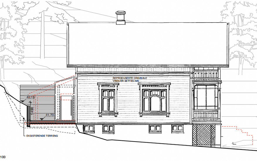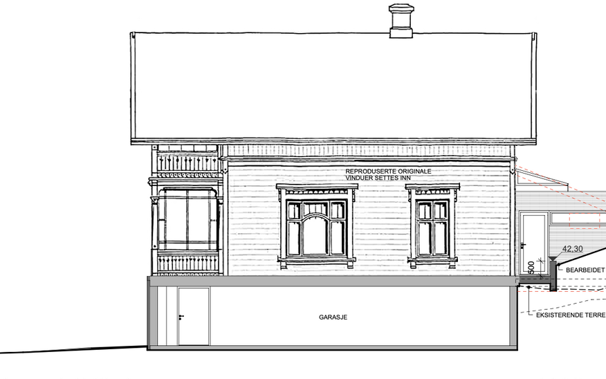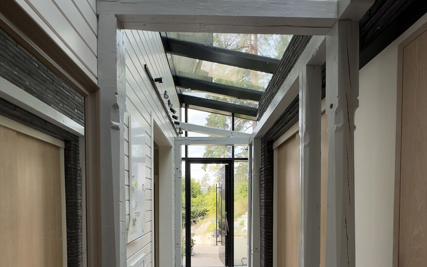 Det opprinnelige inngangspartiet var gjenbygget og endret på et senere tidspunkt. Derfor ble det valgt rive det meste av dette ombygde tilbygget, men beholde konstruksjonen i det opprinnelige inngangspartiet. De profilerte sveitserstilssøylene og dragerne inngår her som et fritt og synlig element i det nye tilbygget.