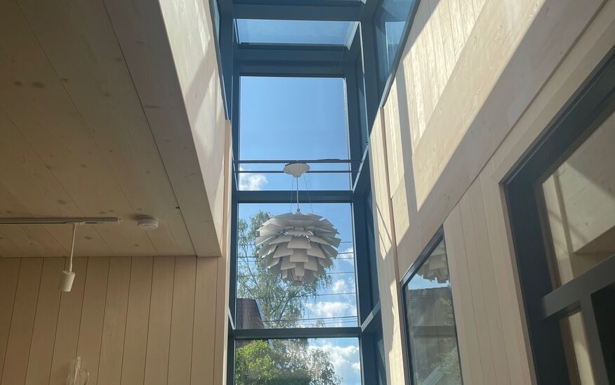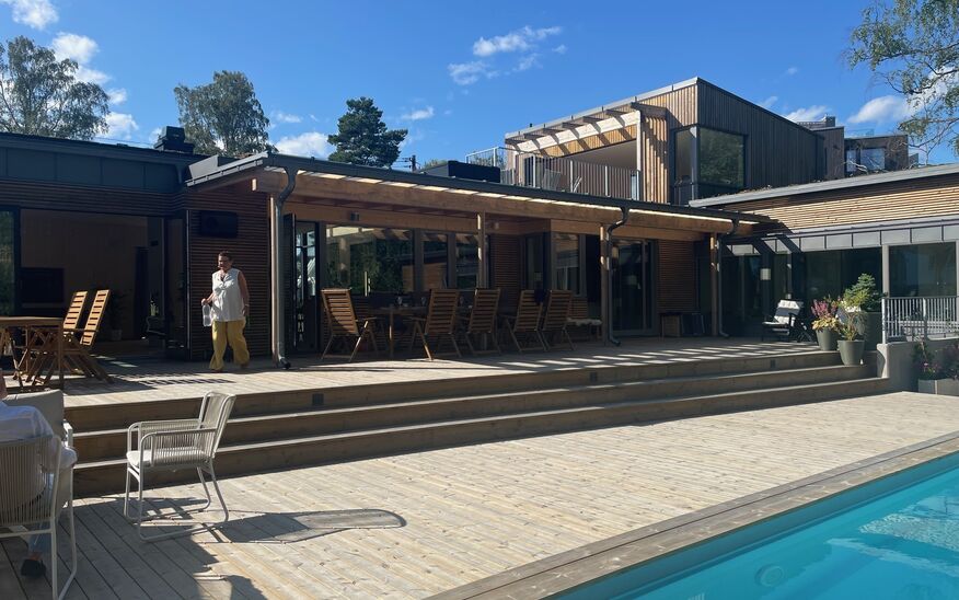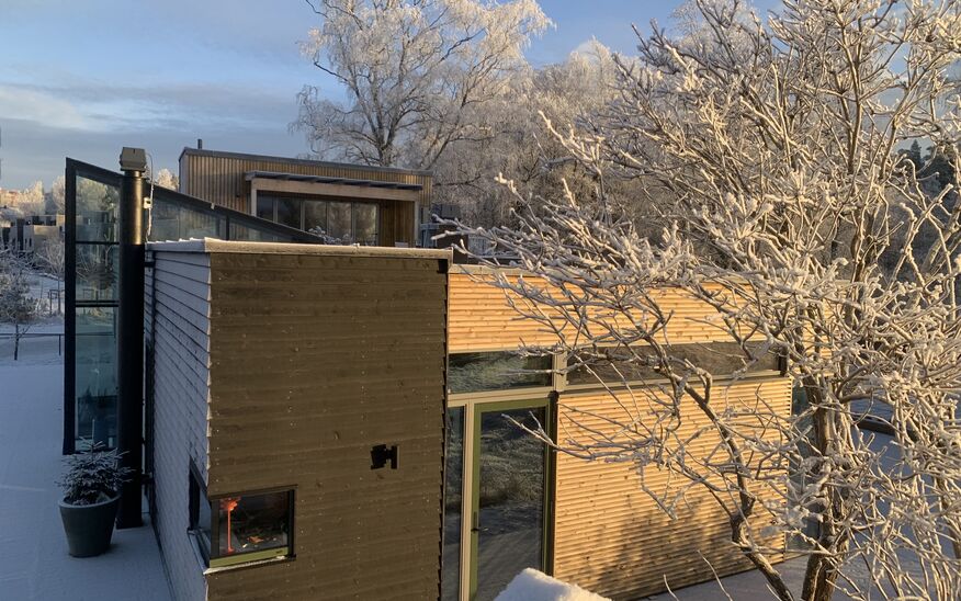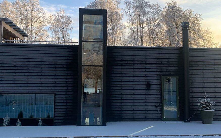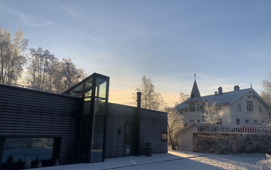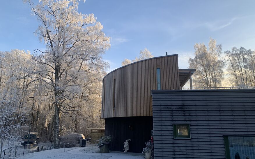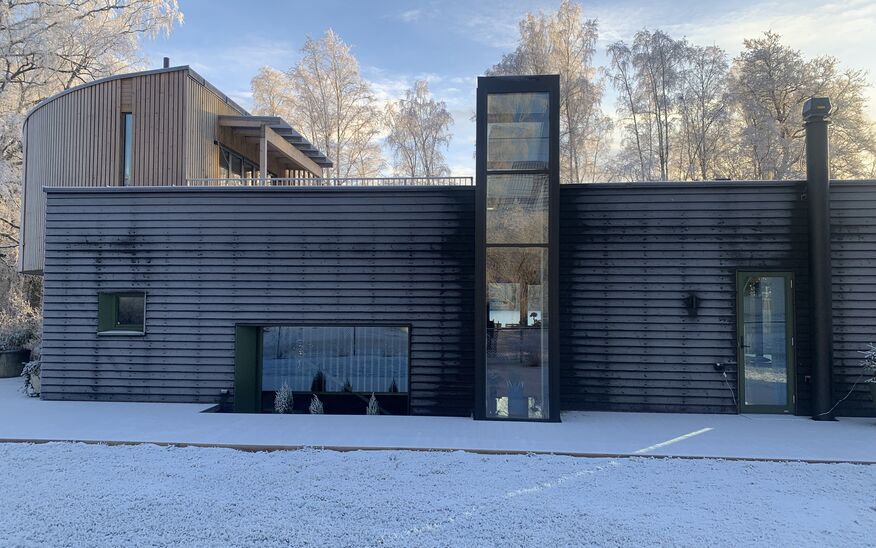 Fasaden spiller på 4 ulike kledningstyper som fremhever husets ytre side mot veien i kontrast til innsiden, dvs. hagesiden. Kontraster i vindusformater og komposisjon mellom tette mot åpne volumer, horisontale og vertikale elementer skaper husets arkitektoniske uttrykk. Huset er en respektfull kontrast til Liljevik – lave volumer i god avstand, og har en naturlig fargepallett som ikke vil konkurrere med det gamle, hvite huset. Innvendige oppholdsrom og gangsoner er kledd med lys, ubehandlet ospepanel.