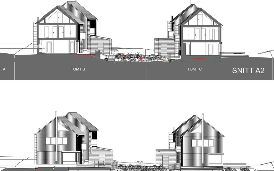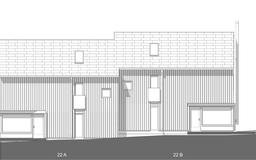 Tomannsboligene har tradisjonell saltaksform og trekledning, men med skarp takvinkel og knappe takutstikk fremstår boligene som moderne, men solide.