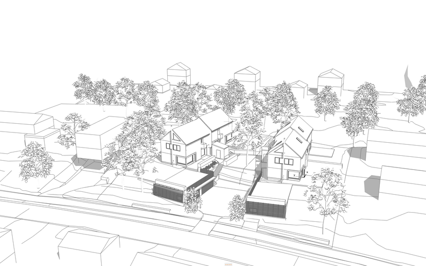 Oppdragsgiver kjøpte naboeiendommen og vil utvikle de to tomtene til 2 tomannsboliger og ny enebolig. Tomten ligger vestvendt med fall ned mot Valhallaveien. Tomannsboligtomtene får felles adkomst og parkeringsanlegg mot veien. Parkering og garasjer må sprenges ned i terreng for å tilfredstille stigningskrav til adkomst. Dette gir anledning til å benytte garasjetakene til verdifullt uteoppholdsareal. Det er vesentlig å tilrettelegge for et godt bomiljø med en klar nabolagsprofil, felles opphold for lek og samtidig sørge for solrike, private uteplasser for alle. Tomannsboligene får inngang fra tunet og boligene har derfor en planløsning som med enkle grep kan speiles om den sentriske trappen. Alle boligene har oppholdssoner i 1. etasje med utgang til terreng.