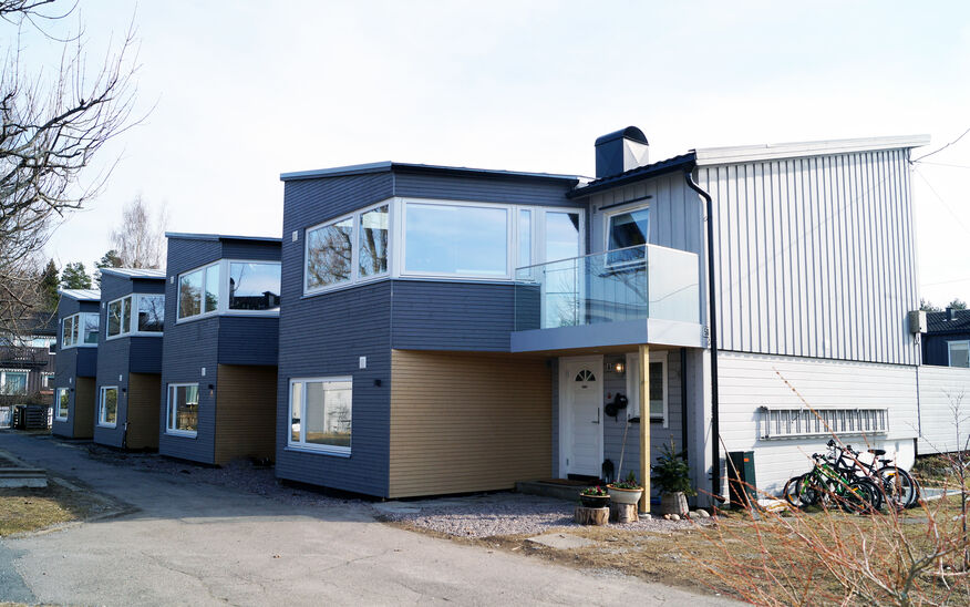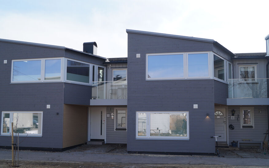 Tyribo Sameie på Hellerasten består av syv rekkehus fra 60-tallet. Vi fikk i oppgave å lage en prototype for et arealeffektivt tilbygg med et minimalt fotavtrykk. Reguleringsplanen ga tilgang til å utvide hver bolig med maksimalt 21 m2. Løsningen ble et to-etasjers tilbygg på inngangssiden som gir et ekstra soverom i 1.etg og en utvidelse av kjøkkenet i 2.etasje.