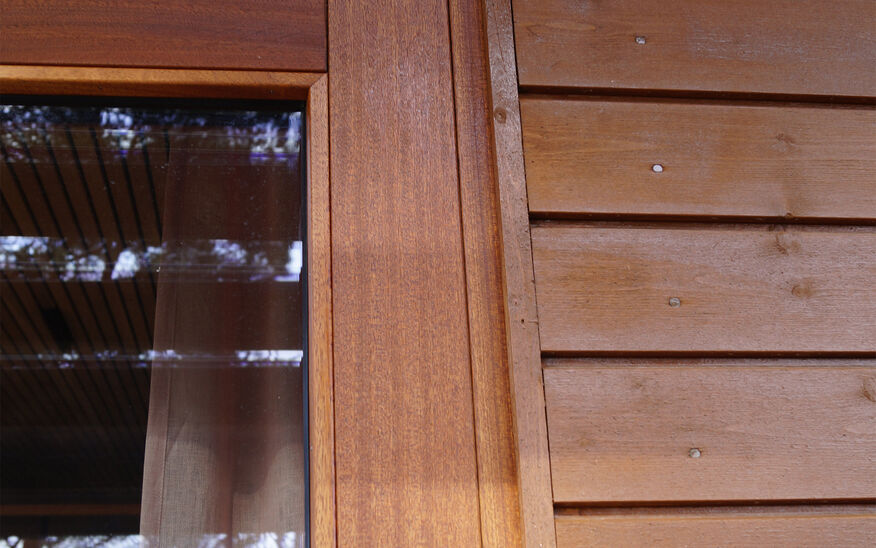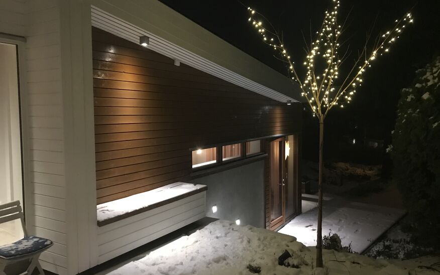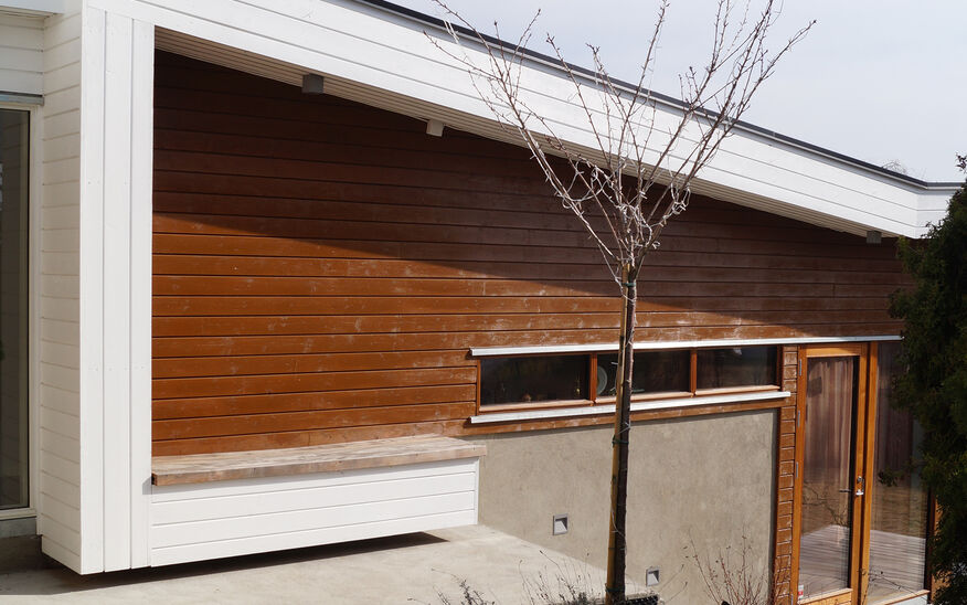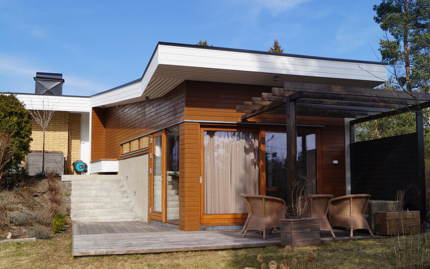 Hovedboligen er et typisk 60-talls trefunkishus med flatt tak og en tydelig horisontal gesimskasse. Tilbygget tar opp disse tydelige linjene, men på en mer dynamisk måte ved å gi det en vinkel som følger terrengretningen, for så å vippe seg opp igjen. Slik er det skapt et uttrykk fra vår tid, samtidig som at det knytter seg til det eksisterende huset uten at det har blitt endret.